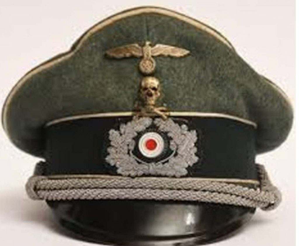 Justo bajo el águila se dispone el Totenkopf, la calavera con tibias cruzadas, uno de los símbolos más antiguos y mal interpretados de la tradición militar europea. En este contexto no es un emblema de terror ni de ideología, sino un distintivo de élite. El Totenkopf que aparece en esta gorra es pequeño, tridimensional, metálico y de modelado realista, rasgos propios de los regimientos prusianos de húsares de guardia, en particular los Leib-Husaren-Regiment Nr. 1 y Nr. 2. Su significado histórico es el de lealtad hasta la muerte, desprecio al peligro y disposición al sacrificio absoluto por el soberano. Esta tradición se remonta al siglo XVIII y estaba plenamente consolidada más de cien años antes del nacionalsocialismo, sin conexión ideológica con este.