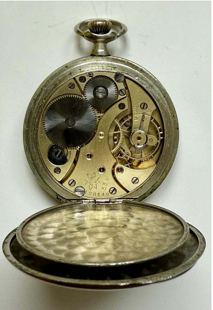 Reloj de bolsillo militar Junghans de oficial de la caballería ligera utilizado por el 17.º Regimiento de Infantería y el 13.º Regimiento de Caballería, del periodo imperial anterior al nacionalsocialismo. Su lema: “Victoria o muerte” con totenkopf en su tapa posterior. El uso del color plateado, frente a otros acabados en la calavera y tibias, responde a la reglamentación prusiana para oficiales de caballería y de infantería.