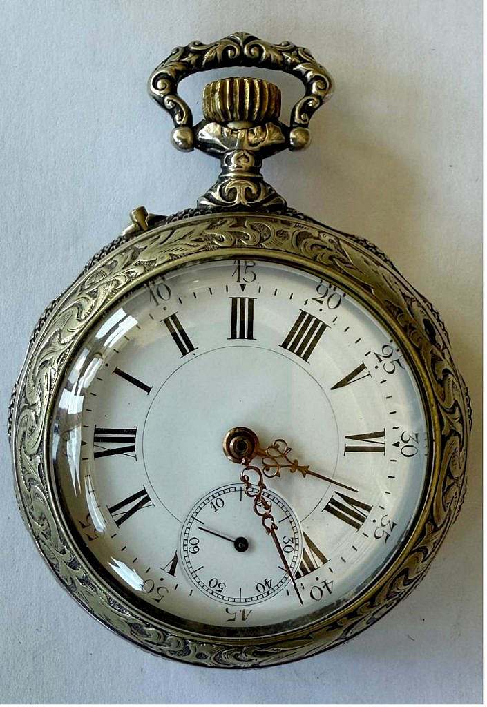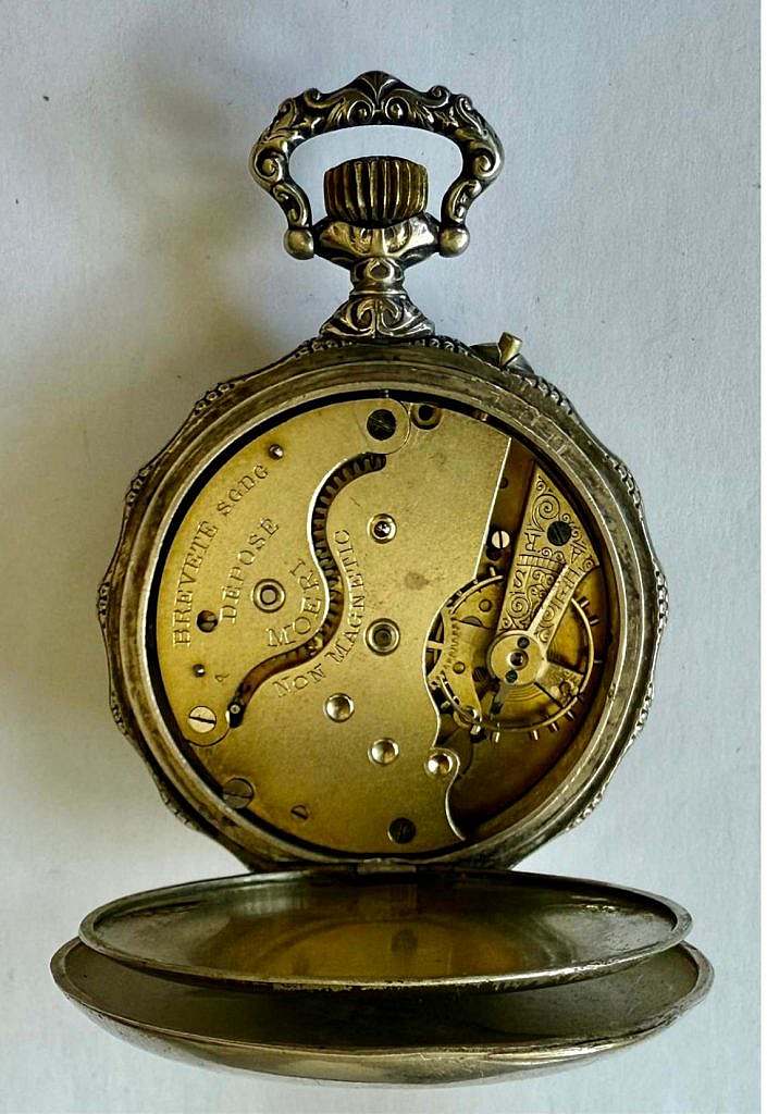 Reloj de bolsillo Moeri (que luego se integraría en Tissot). Con recreación artística repujada, de un Cormorán emergiendo del mar. Brevet SGDG, Depose. Non Magnetic. En 1904, Fritz Moeri patentó este movimiento completo, el calibre de 19 pulgadas denominado «Non-magnetic», que se convirtió en la base de su éxito y producción futura.