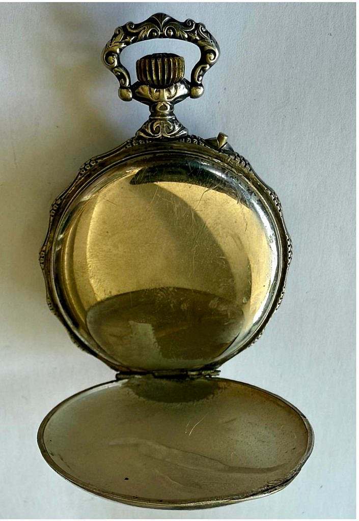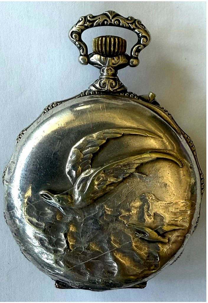 El rasgo más distintivo de este reloj es su tapa posterior repujada. Esta tapa presenta una elaborada recreación artística de un ave marina, un cormorán, emergiendo del mar con grandes olas ante una tempestad. El diseño muestra al ave con las alas desplegadas y el cuello estirado en un momento de acción dinámica. El acabado del repujado es profundo y detallado, capturando el volumen del ave y la textura agitada del agua, lo que añade un valor estético y artístico considerable a la pieza, reflejando el gusto por los motivos naturalistas de finales del siglo XIX y principios del XX.