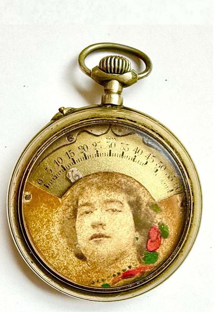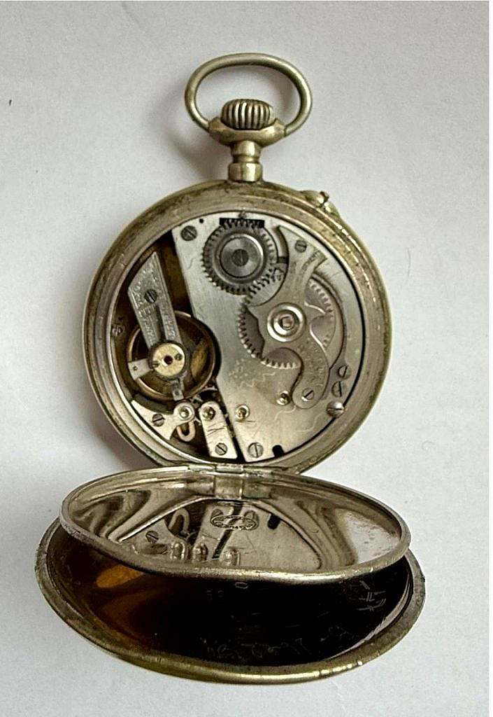 La caja, de líneas sobrias y funcionales, junto con la corona de gran tamaño y el anillo de suspensión, remiten a un reloj concebido para un uso cotidiano, aunque su esfera figurativa introduce un elemento de carácter casi artístico, evocando las corrientes decorativas de la época. La degradación parcial de la imagen, lejos de restar valor, refuerza su autenticidad y aporta una pátina histórica que subraya su recorrido vital.