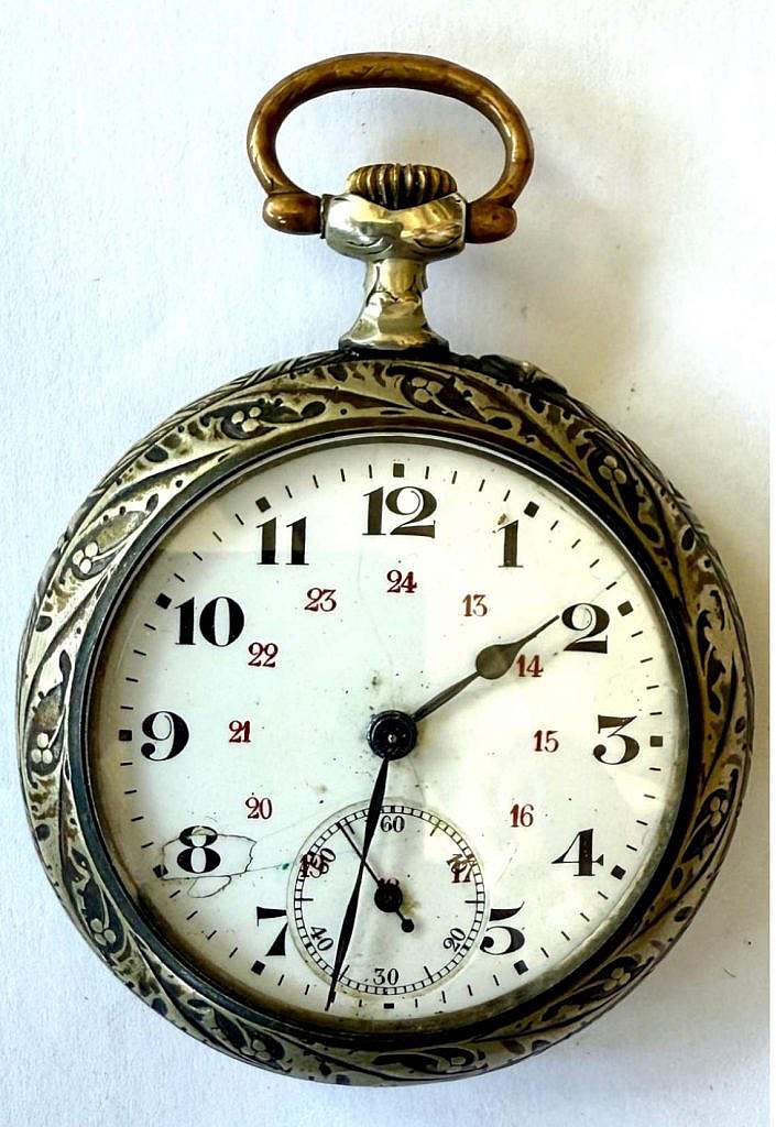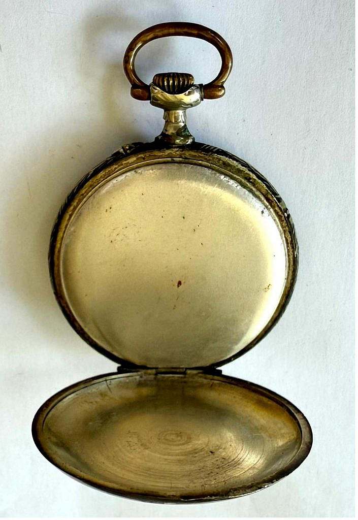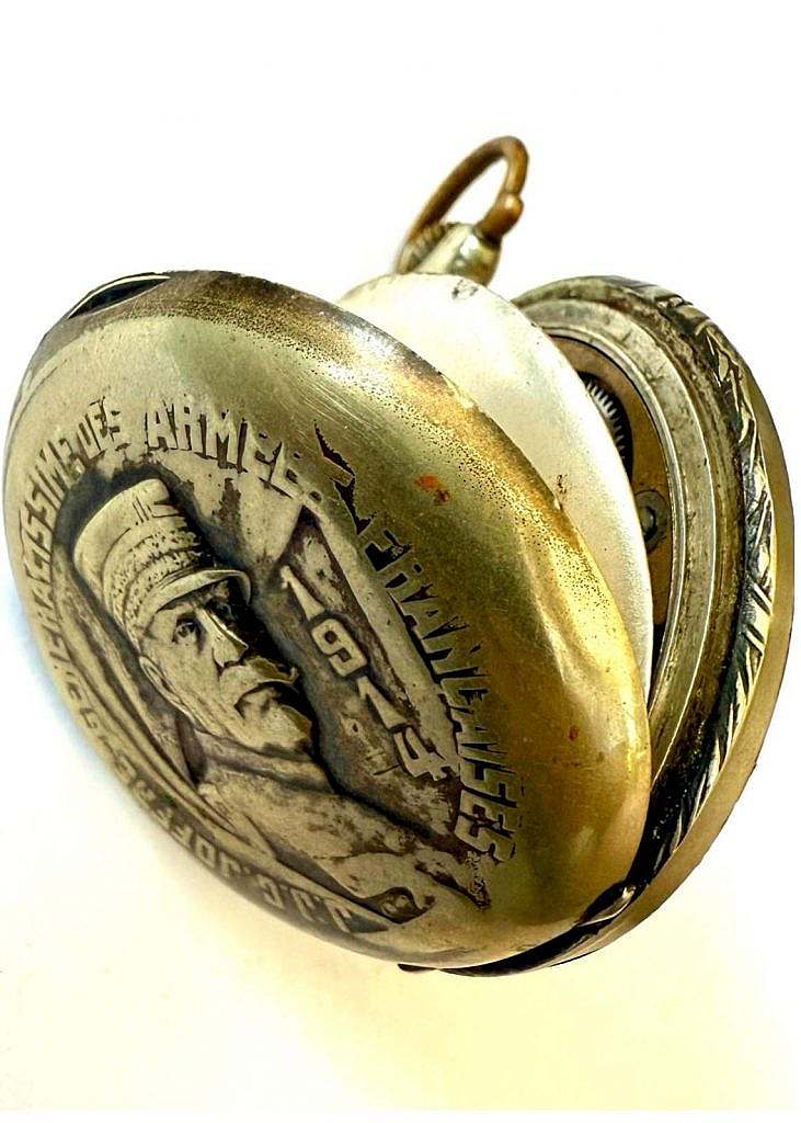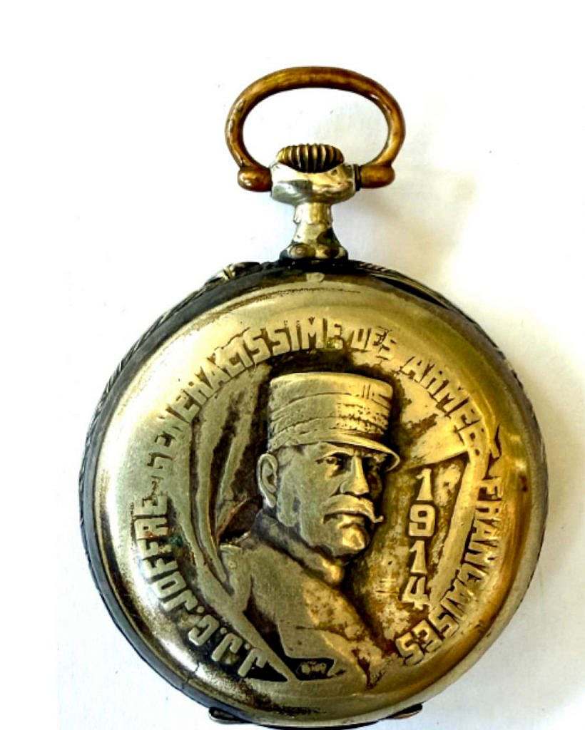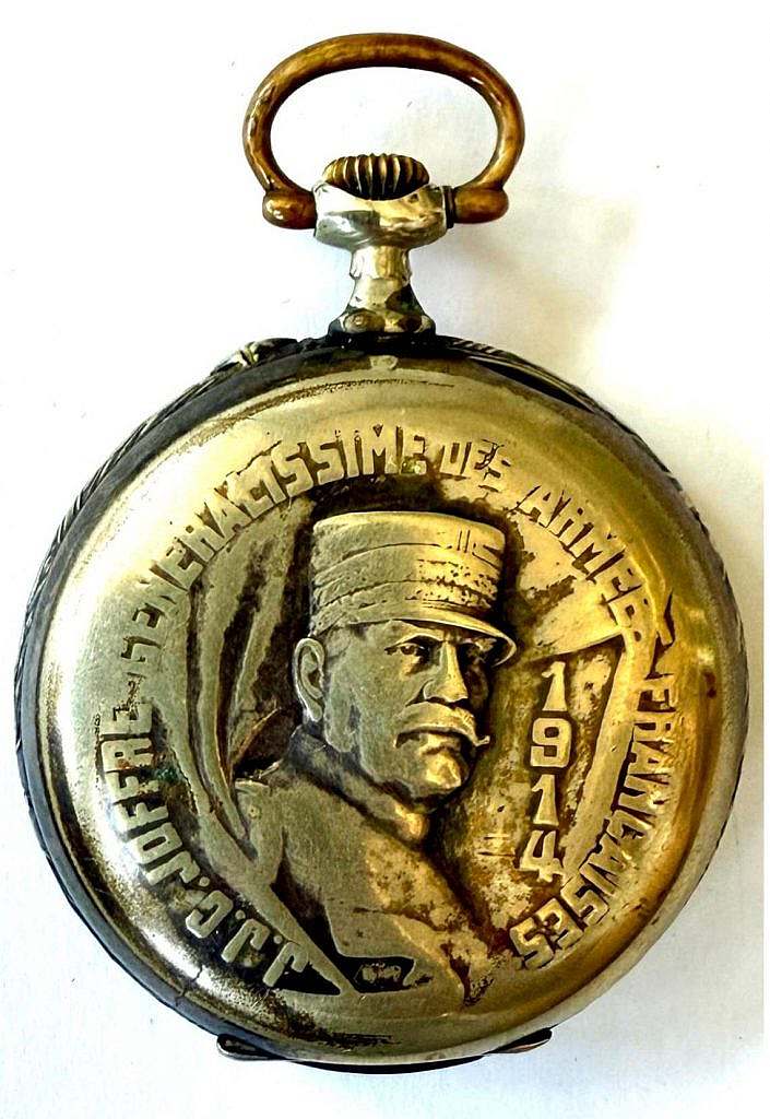 Reloj de Bolsillo muy inusual recuerdo de la Iª Guerra Mundial 1(914-1.918), con la tapa posterior repujada con una escena de J.J.C. Jofre, Generalisime des Armes, 1914. Dotado de patente 35.344.