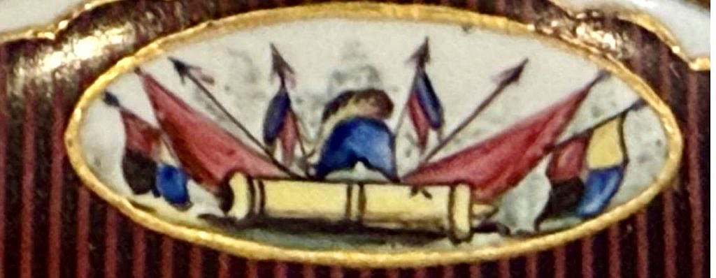 Símbolos militares: Muchas banderas incluían elementos militares como tambores, cañones, lanzas o fusiles cruzados. En el caso de este reloj se ha incluido el cañón. También se podían ver coronas de laurel o roble, que simbolizaban la victoria y la fuerza.