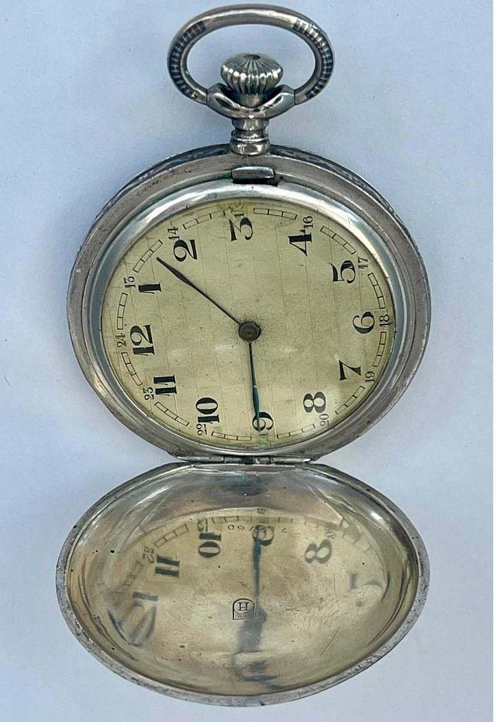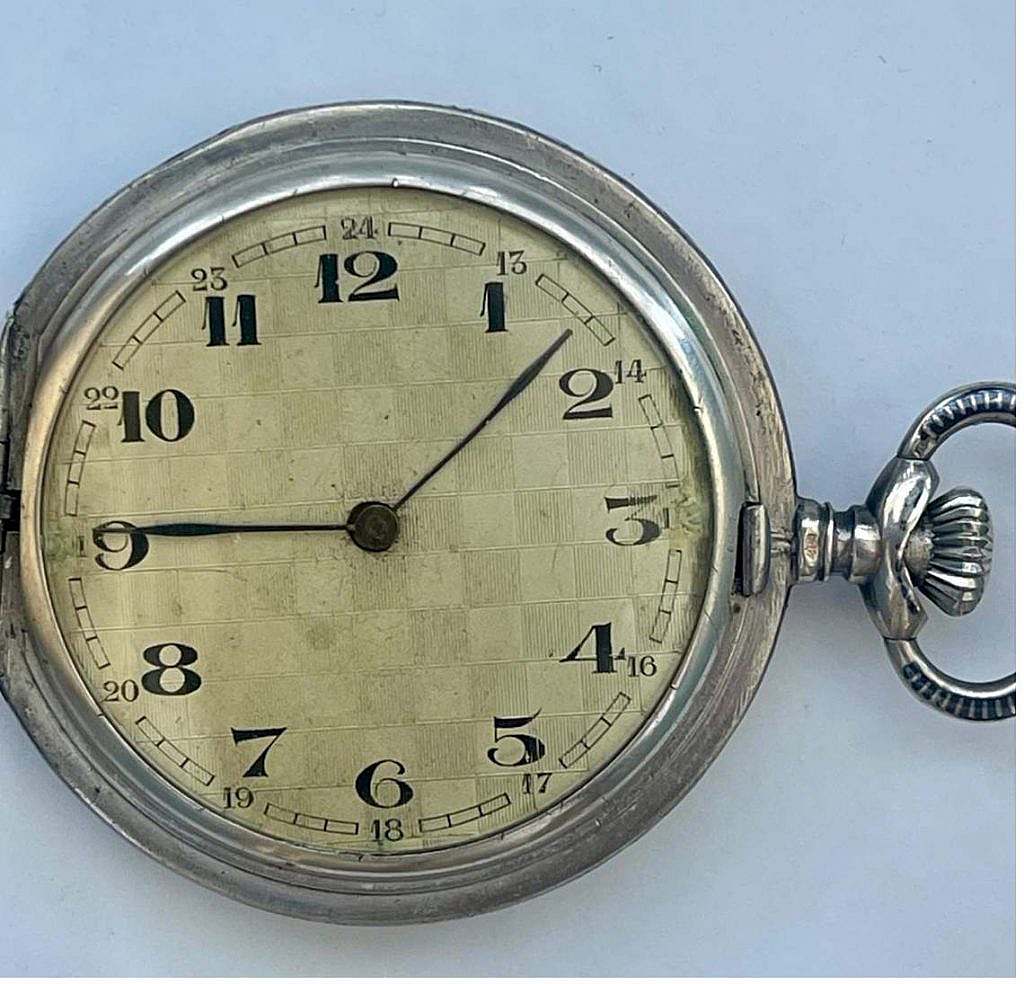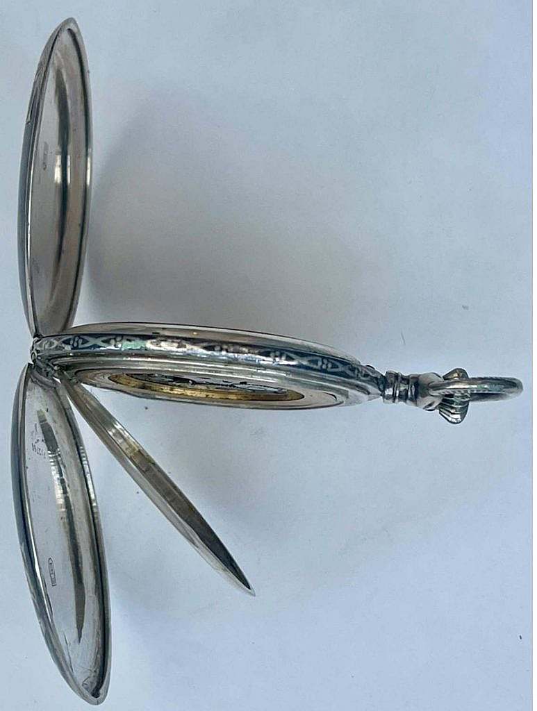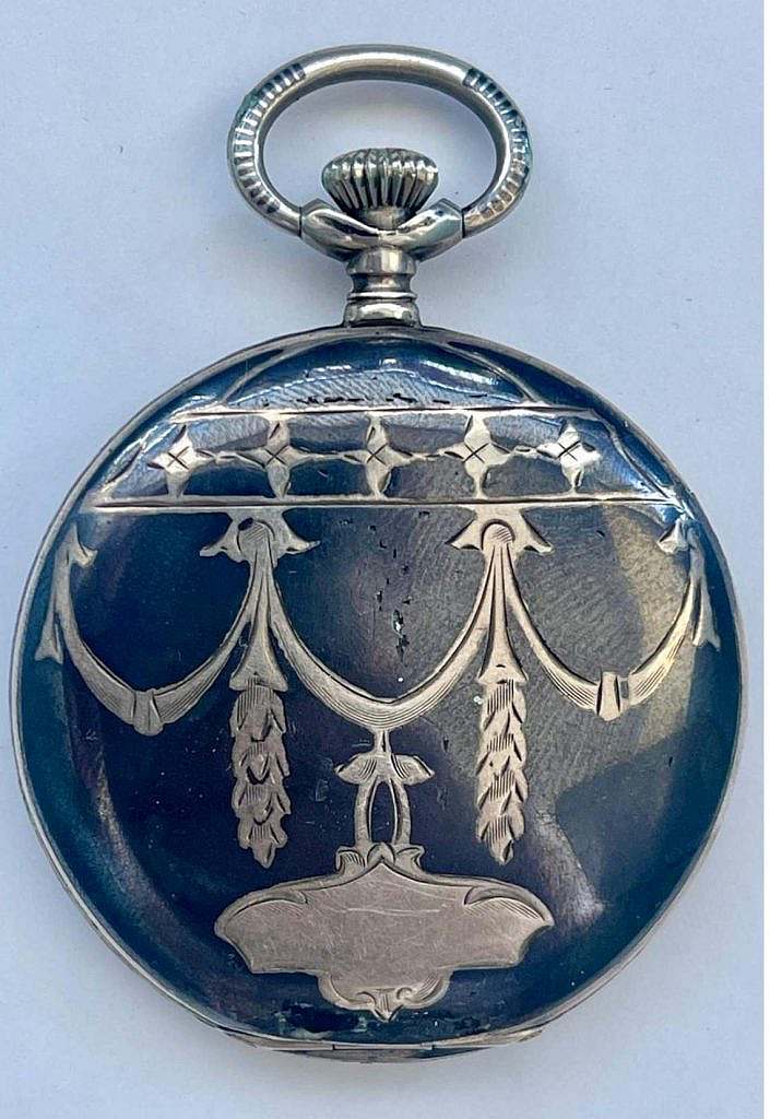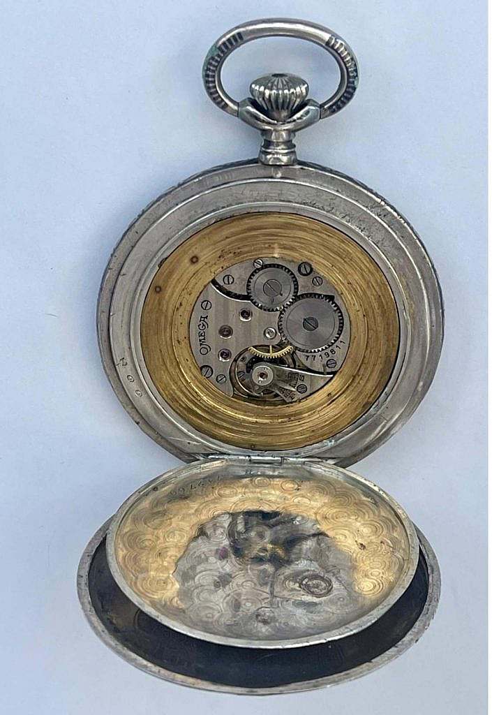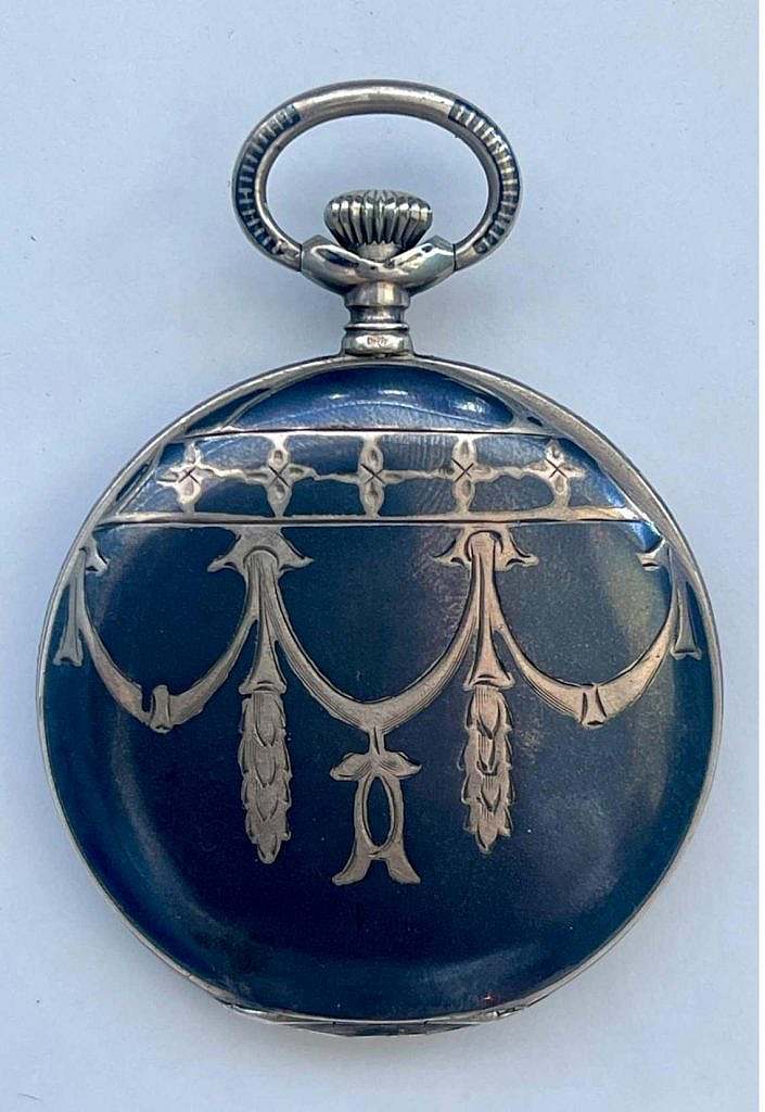 Reloj de bolsillo saboneta de la marca Suiza Omega con trabajo orfebre clásico de Nielado con caja en plata de ley. El reloj saboneta dispone del colgante, la anilla de suspensión y la corona ranurada a las 3. La esfera es en plata de ley con un ligero trasluz de tablero de ajedrez. Dispone de esbeltas y elegantes agujas estilo pelo en azul cobalto. En la placa de características se han grabado profusamente todas las medallas.