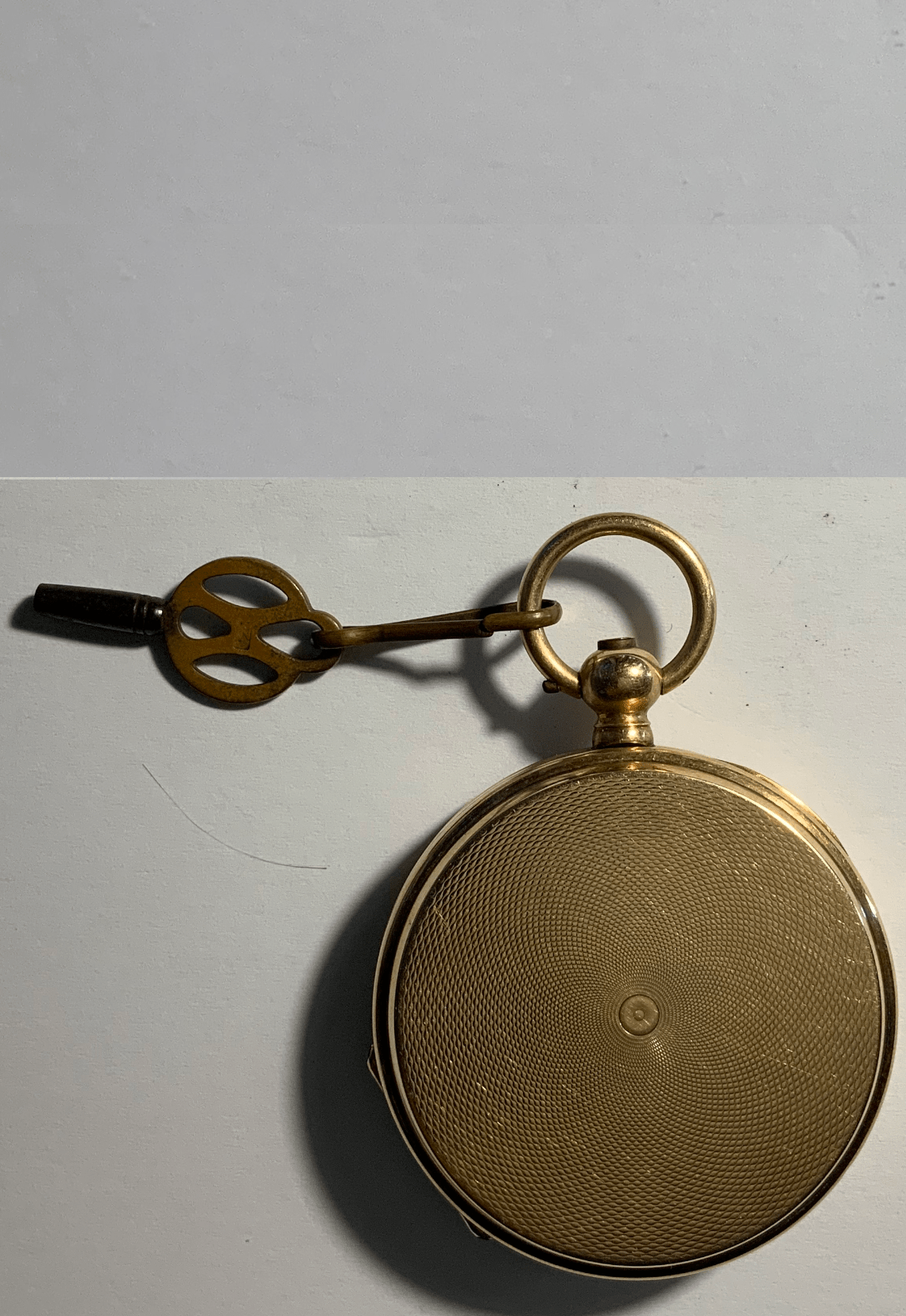La caja es en oro de 18Kl de tres tapas, anterior y posterior grabado guilloche con escudo central para poner las iniciales del propietario. En la tapa interior tiene grabado Echappement a ancre, 15 perres, aiguilles nº92471 Godon y dispone de dos bocallaves para sistema de cuerda y cambio horario.