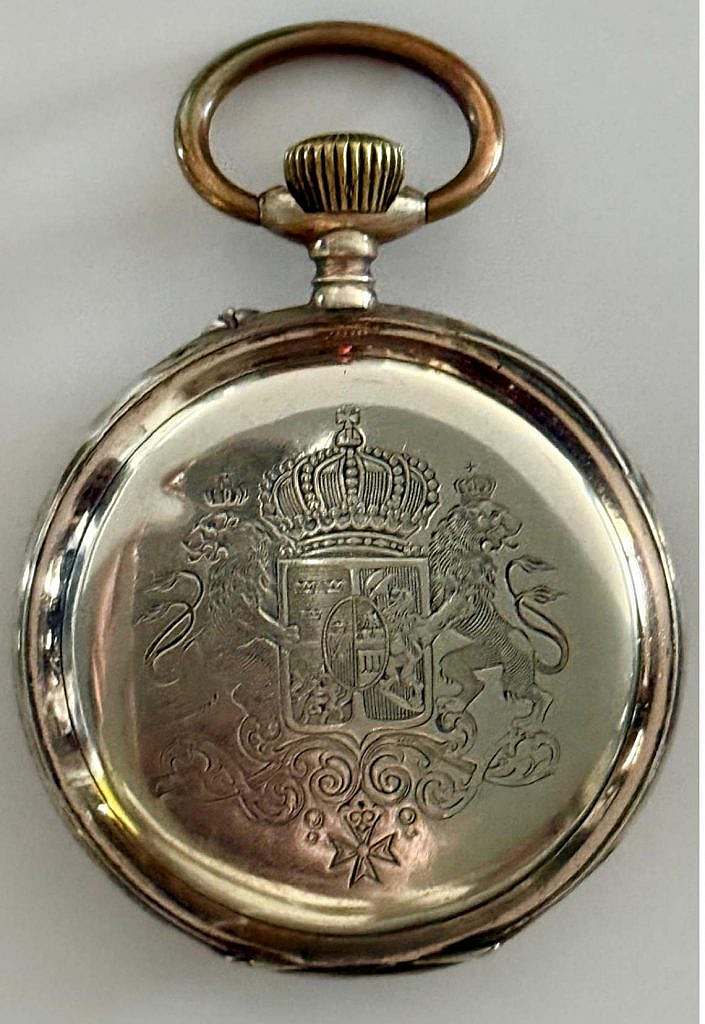 Reloj de bolsillo con caja lepine en plata de ley con bisel sobredorado de grandes dimensiones (6,5 cm diámetro) conteniendo en su carrura el pulsador para el cambio horario a las XIII horas y con profusa grabación del escudo de Armas del Reino de Suecia en su tapa posterior. Escudo utilizado por su diseño y contenido hasta el año 1.905 y es a partir de la grabación en este reloj que poco después entrará en desuso y se dejasen de grabar el escudo dando paso al nuevo. El cambio en el escudo de Suecia fue en 1905 y estuvo relacionado con la disolución de la unión entre Suecia y Noruega, un evento político trascendental que transformó las relaciones entre ambos países.