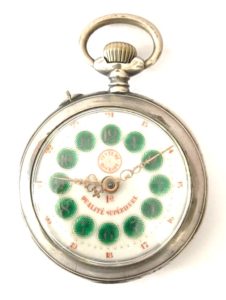 Reloj de bolsillo de caballero con motivo ecuestre de la firma SISTEME ROSKOPF, que produce relojes de bolsillo de calidad superior a ROSKOPF (marca oficial) sin serlo propiamente ni ser una marca patentada. En otras palabras, la marca SISTEME ROSKOPF trata estratégicamente de hacerse pasar por un ROSKOPF, reloj económico de la época, pero de suntuosa decoración y alta precisión.