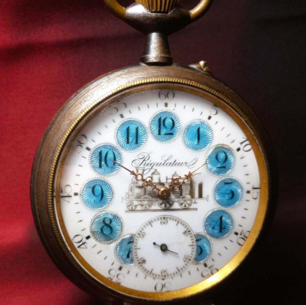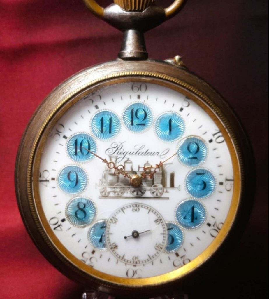 Reloj de ferroviario regulador, estos relojes de ferroviarios tenían una importancia crucial en el trabajo  seguro y puntual de los ferrocarriles en el siglo XIX y principios del XX. Estos relojes, conocidos como relojes de bolsillo de ferroviario, estaban especialmente diseñados para ser extremadamente precisos y piezas en las que confiar. La puntualidad en los horarios de trenes era esencial para evitar colisiones y garantizar la seguridad de los pasajeros y la carga. Los relojes ferroviarios estaban sincronizados con un tiempo estándar, generalmente el tiempo del observatorio local, y todos los horarios de trenes se basaban en este tiempo. Los relojeros de ferrocarriles se encargaban de mantener estos relojes con una precisión excepcional y de calibrarlos regularmente a la vez que recomendaban modelos y marcas dentro de los autorizados. Además, los relojes de ferroviarios solían tener características como segundero de estilo «barrido» para una fácil lectura de los segundos, cajas protectoras resistentes para evitar daños y cristales de vidrio grueso para mayor durabilidad. En resumen, los relojes de ferroviarios eran esenciales para garantizar la seguridad y la eficiencia en el desempeño de los ferrocarriles y su precisión era fundamental para mantener los horarios y evitar trágicos accidentes.