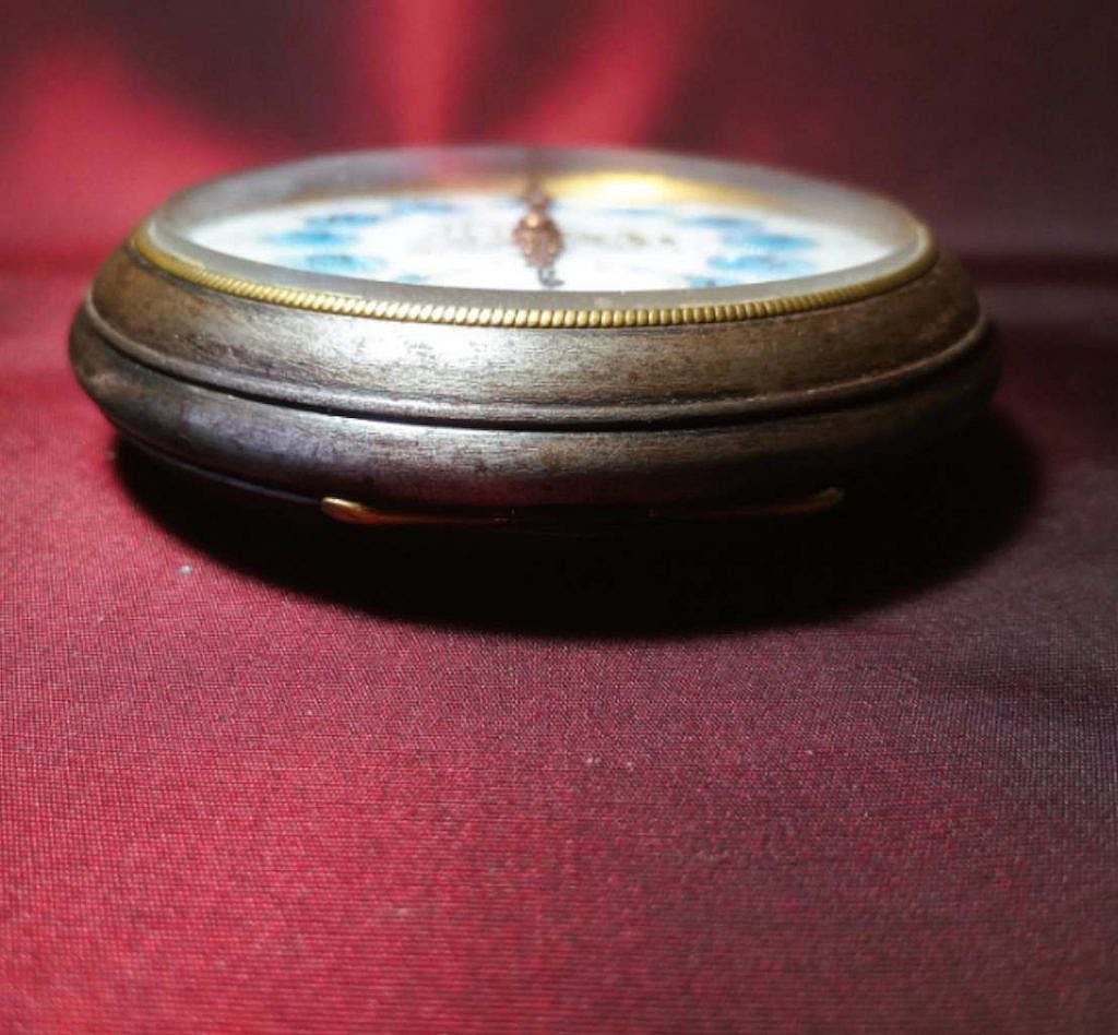 El reloj es de estilo lepine con pulsador para el cambio horario entre las XIII y las XIII horas y la colgante anilla de suspensión y corona ranurada a las XII. Su esfera es en esmalte blanco sobre cobre convexo y con segundero a las VI. La numeración horaria es arábiga en esmalte negro sobre cartucho en exquisito esmalte azul celeste sobre grabado Guilloche y rematado en esmalte plata en su perímetro circular. La numeración para las 24 horas se ha dispuesto en numeración arábiga en esmalte de color negro produciendo un bonito y colorido contraste en las esferas.