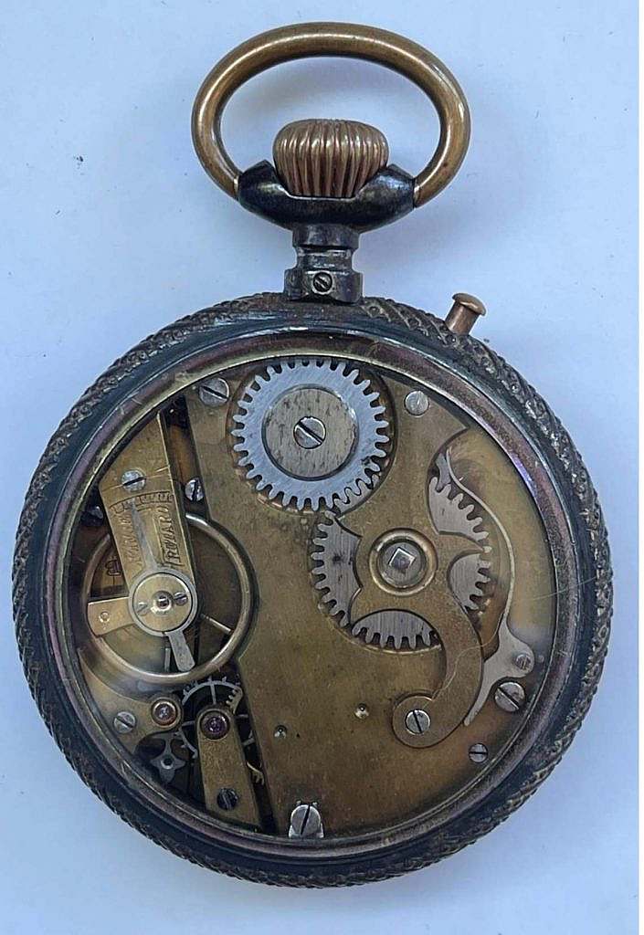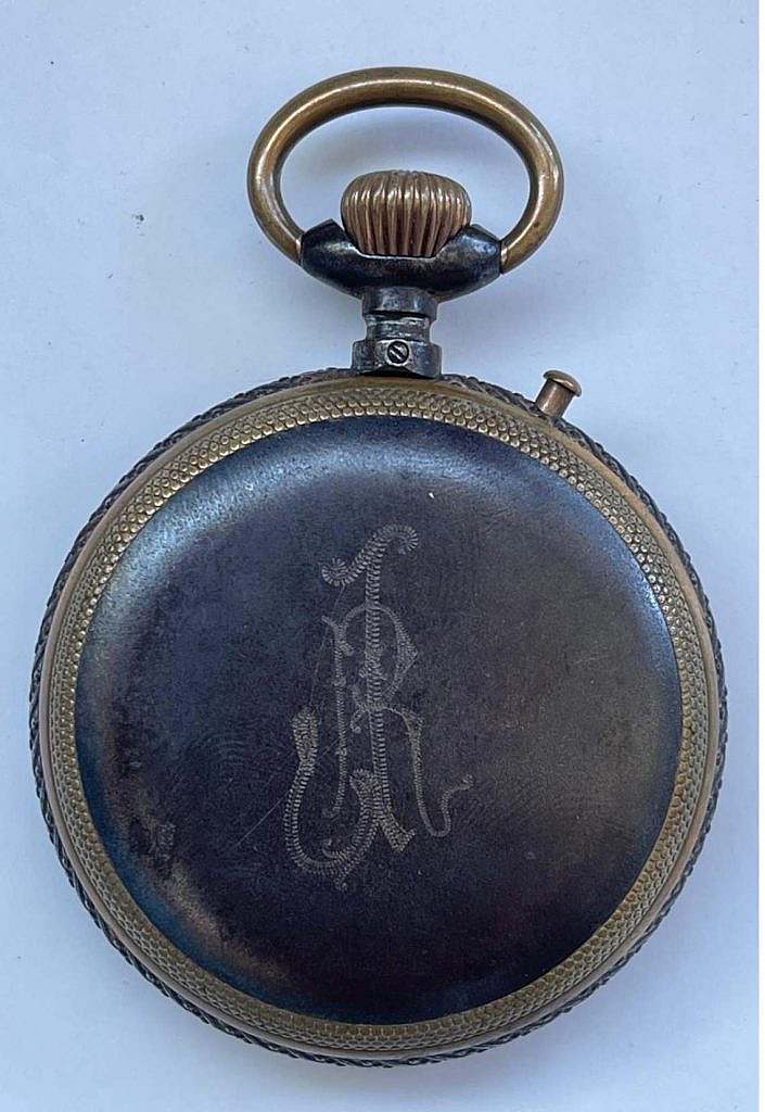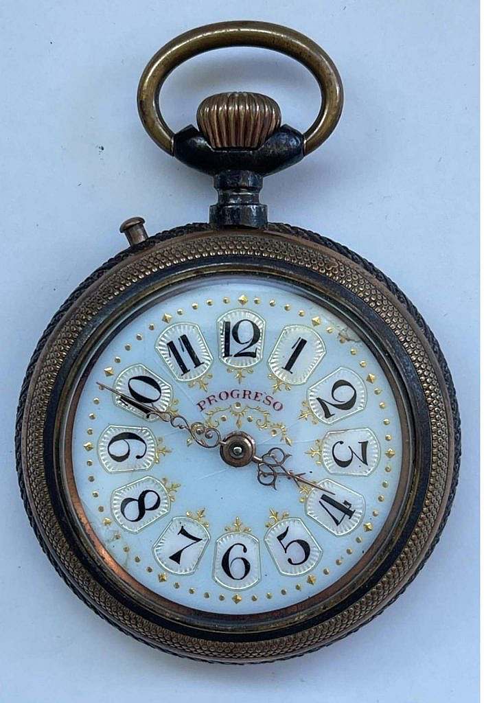 Reloj con caja en hierro ferroso dotada de dos elegantes biseles en latón dorado a puntos concéntricos apretados. Reloj de estilo lepine con el colgante, anilla de suspensión y el colgante a las XII de los maestros relojeros de la marca suiza PROGRESO perteneciente a las manufacturas DIETRICH FRÈRES.