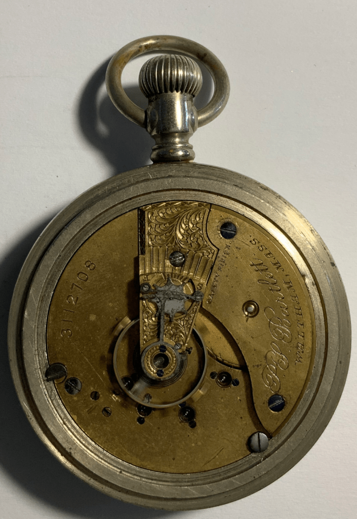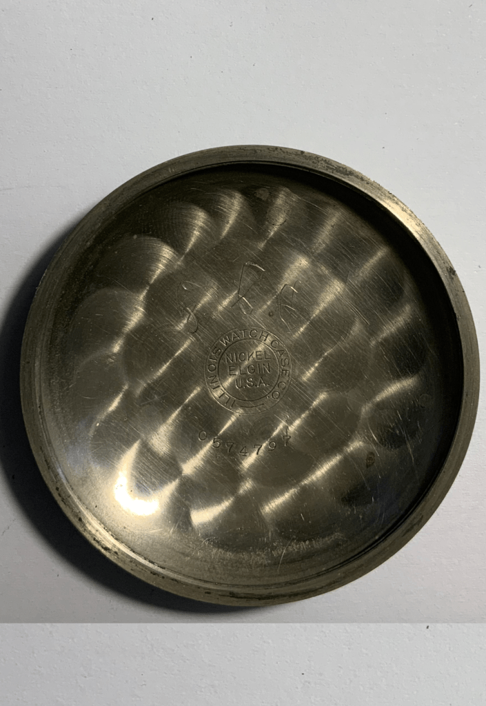 La marca “AM Watch CO. WALTHAM” ha sido esmaltada en negro a las XII con segundero a las VI. En el interior de la tapa posterior a rosca ha sido grabada: “ Illinios watch case Co. Nickel , Elgin USA, Nº 05774797”.