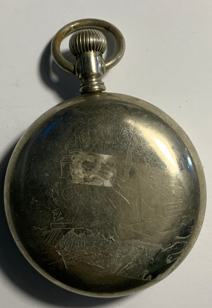 Reloj de bolsillo con la corona ranurada, la anilla de suspensión y el colgante a las XII con caja estilo lepine a rosca de 6 cm de diámetro y 2 cm de ancho en su carrura. La caja es en niquel y crono, en el que en su tapa posterior se ha grabado una locomotora a vapor.