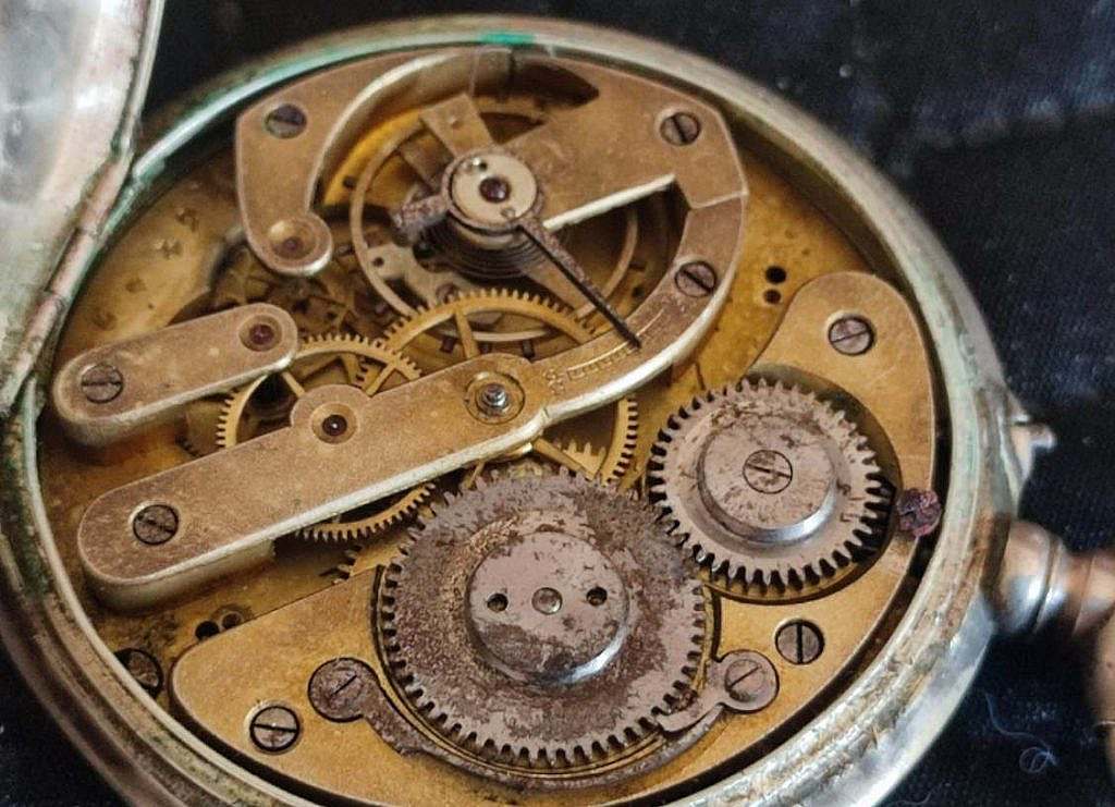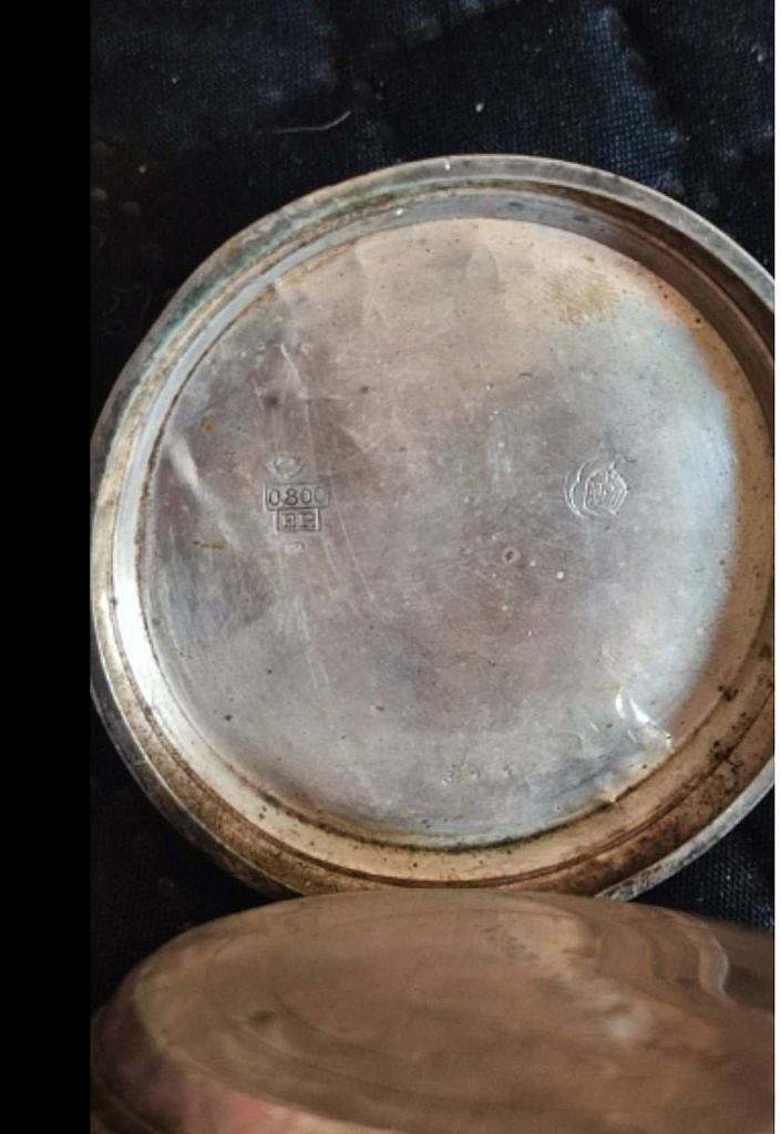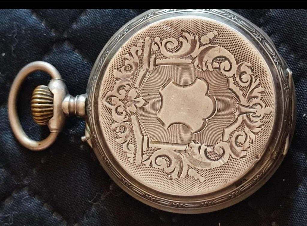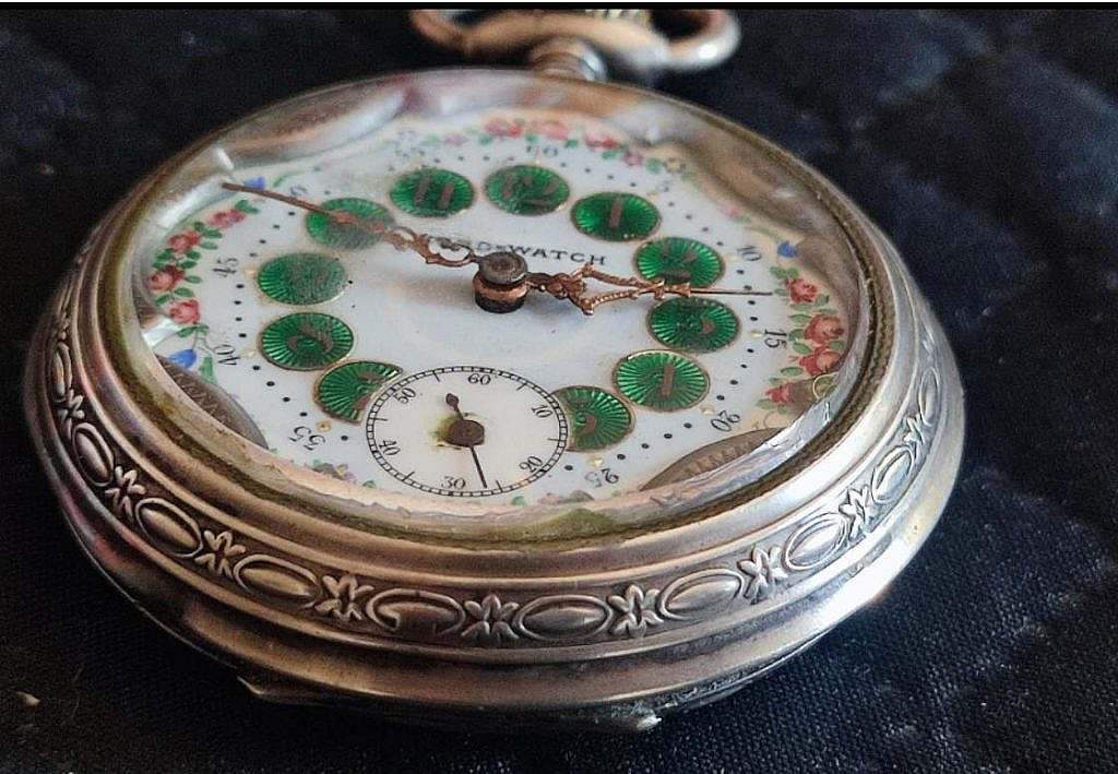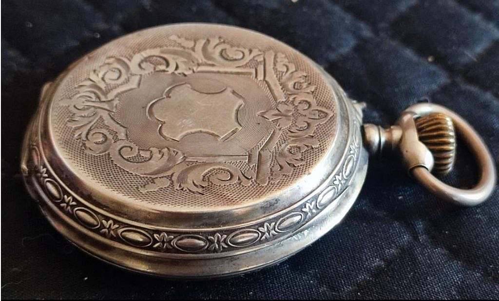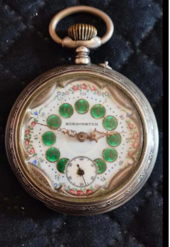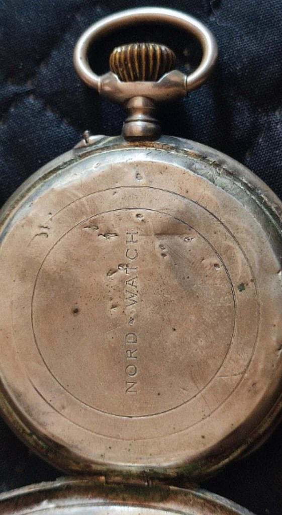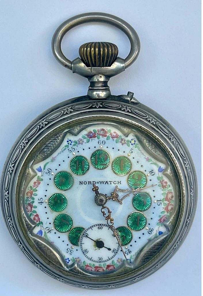 Elegante reloj de la marca Nord-Watch, de estilo lepine con el colgante la anilla de suspensión y la corona ranurada a las XII. Su pulsador para el cambio horario está en la carrura a las XIII. La caja es en plata de ley de grandes dimensiones tamaño Goliat de 62 mm. en la que en su tapa posterior se ha grabado con grabado Guilloche a rombos concéntricos apretados distintos motivos vegetales y florales rodeando un escudo para grabar las iniciales de su propietario. En la placa de características también en plata de ley se ha grabado la marca en letras mayúsculas de Nord Watch.