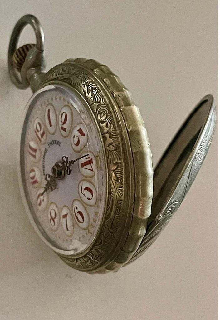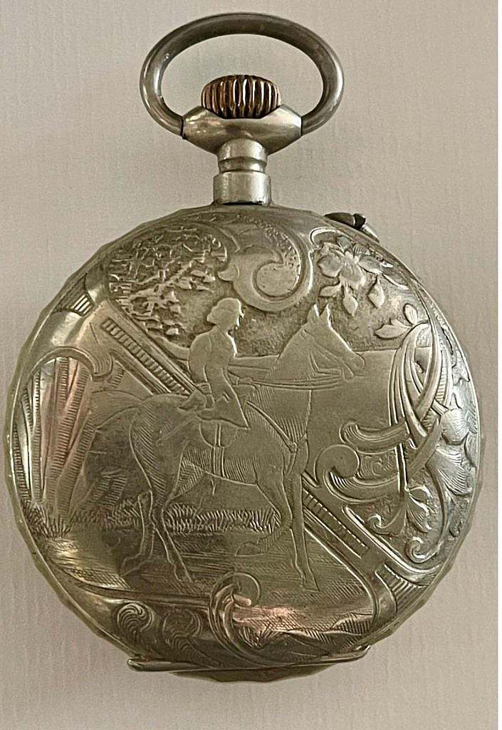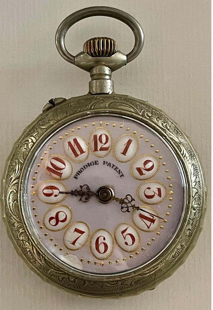 Reloj de la marca PRODIGE, marca Patentada y de estilo Roskopf  en caja lepine en níquel y cromo con el colgante, anilla de suspensión y corona ranurada a las XII. La carrura dispone de pulsador para el cambio horario a las 11. La tapa posterior ha sido decorada con un motivo equino en el que se representa a una amazona que lo hace de lado, ha dicho estilo se le denomina “monta a la amazona” o “monta lateral”. En esta modalidad que se ha representado en el reloj la amazona monta con ambas piernas hacia un solo lado del caballo, en lugar de a horcajadas. Tradicionalmente, este estilo era utilizado por mujeres en Europa antiguamente debido a las normas sociales que consideraban inapropiado que ellas montaran de otra manera. La esfera es en inusual esmalte rosa con numeración a cartuchos en esmalte blanco sobre los que se ha esmaltado en rojo la numeración arábiga.