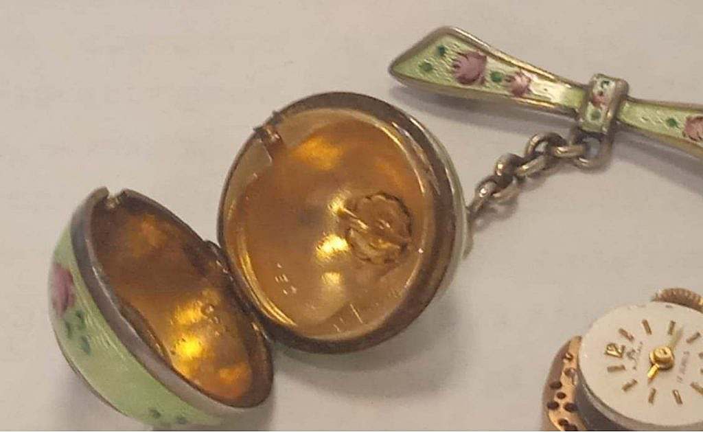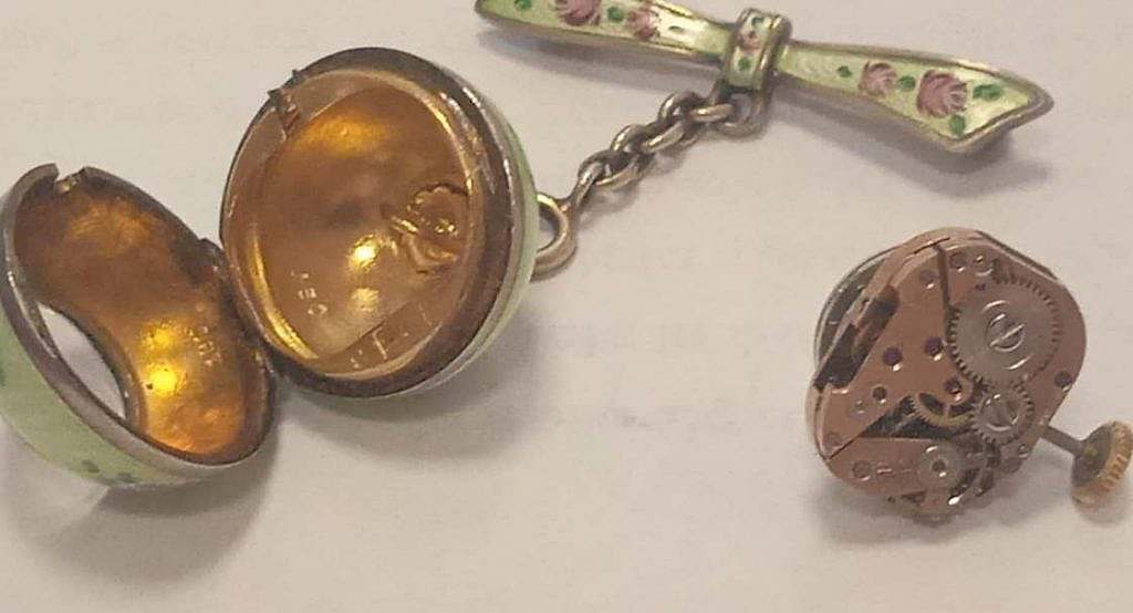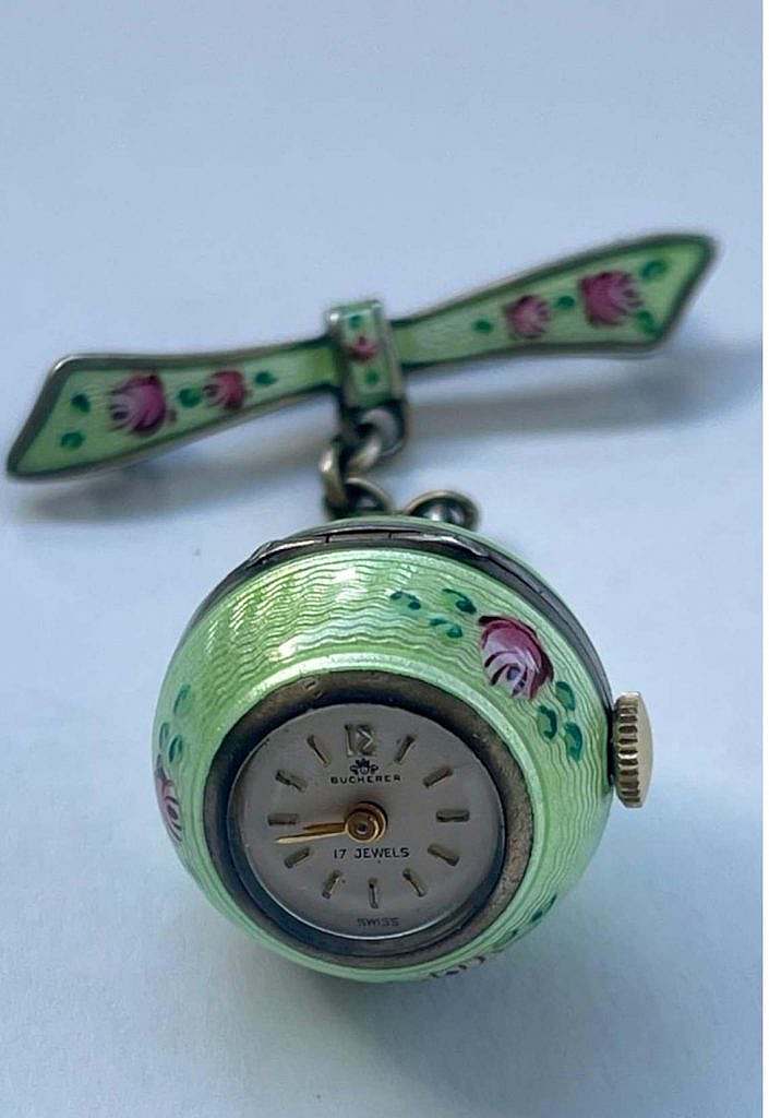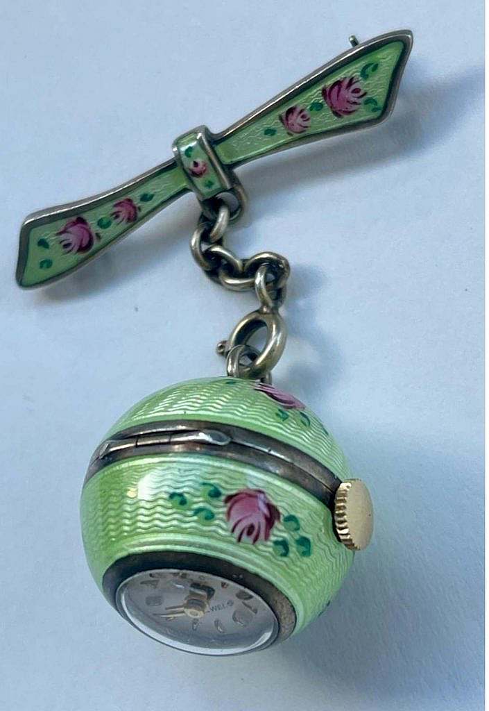 Reloj de prender de la marca Bucherer en forma de bola para dama en esmaltes verdes y rojos sobre grabado Guilloche.