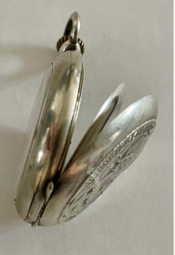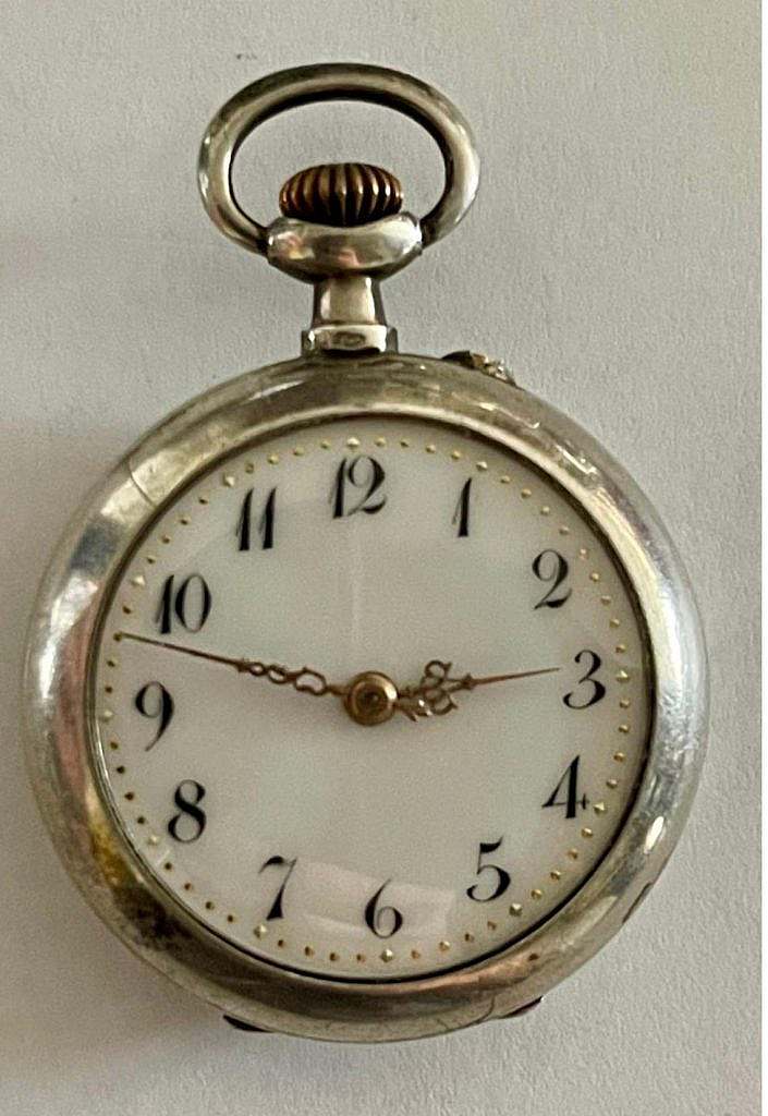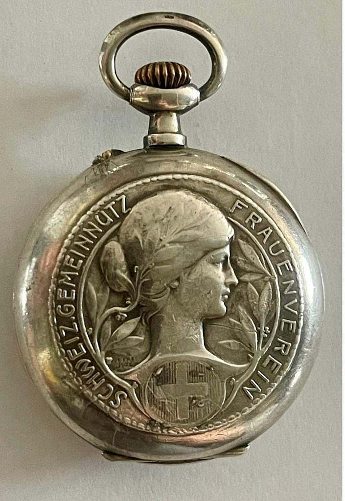 Reloj de bolsillo con caja en plata de Ley de estilo lepine para dama con el colgante la anilla de suspensión y la corona ranurada a las XII. La construcción de este reloj fue en el año 1890. Se trató de un encargo expreso de sus cofundadoras entre las que destacan mujeres de la importancia para los derechos de las mujeres y primeras feministas en la historia como Gertrud Villiger-Keller (Presidenta de la Asociación SGF) y Emma Coradi-Stanley (Feminista Suiza y mienbro del consejo de la SFG).