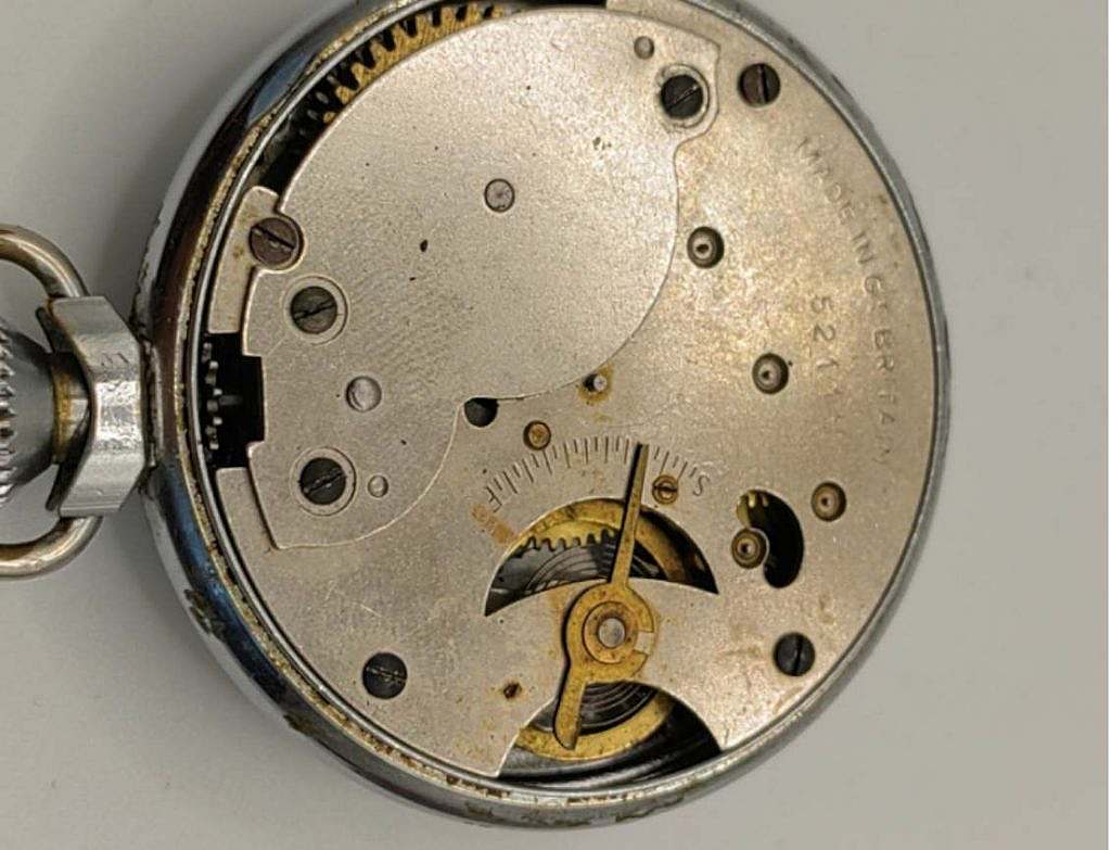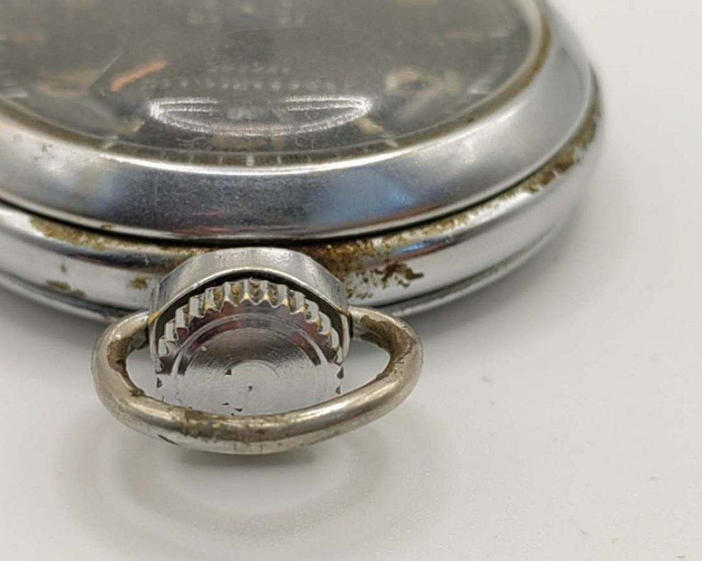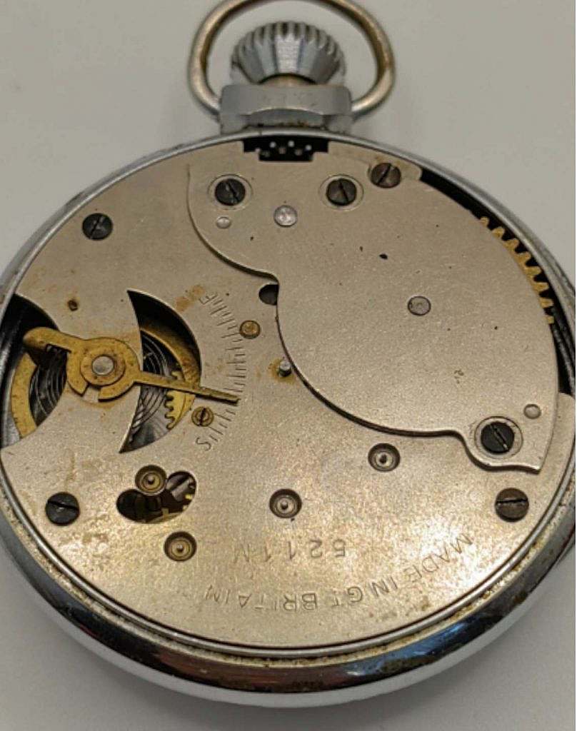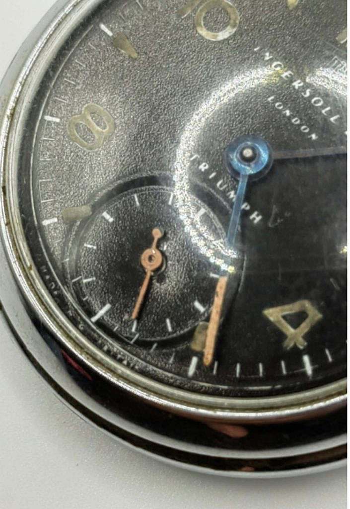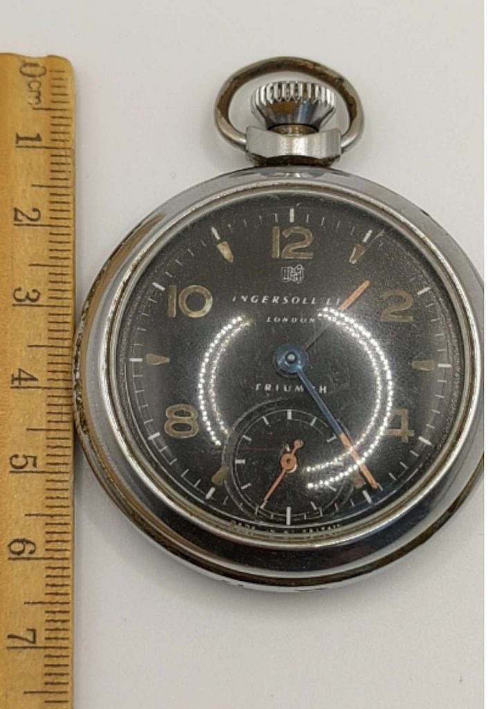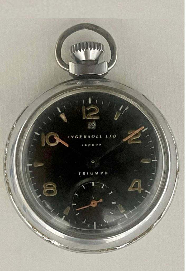 El reloj de bolsillo objeto de esta catalogación es de la marca Ingersoll LTD, London, Modelo Triumph con caja de estilo lepine con el colgante, anilla de suspensión y corona ranurada a las XII. La caja además es totalmente lisa producida en níquel y cromo. Destaca en el que la belleza se centra en su esfera que está producida en metal negro con numeración arábiga luminiscente y agujas estilo pelo negras luminiscentes y en su extremo en radio. Su segundero ha sido provisto a las VI.