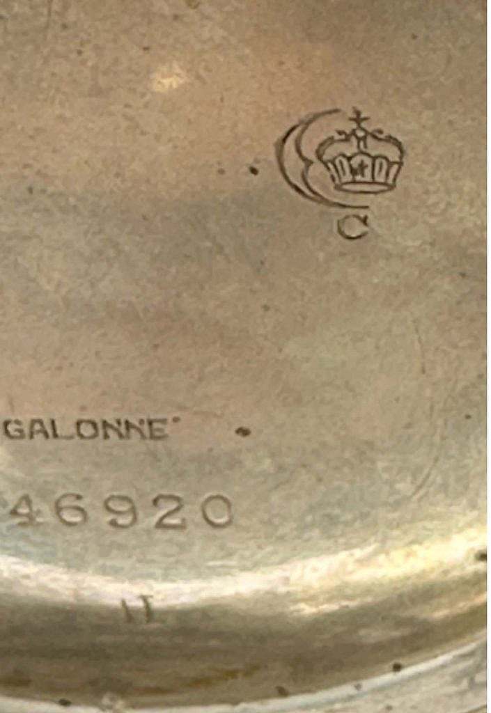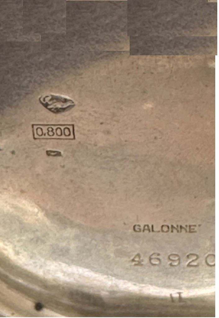 La caja es lepine con el colgante, la anilla de suspensión y la corona ranurada a las XII. El conjunto de la caja es en plata de ley y los dos biseles en oro.