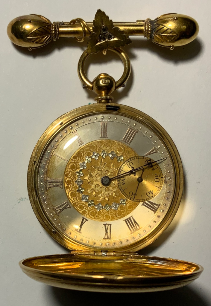 Reloj de bolsillo de una exquisita manufactura. Es un reloj para dama estilo saboneta, de tres tapas en la que el colgante, el pulsador y la corona están a las III horas. Ha sido realizado en oro amarillo de 18 Kl y esmalte en la tapa anterior, representando un ángel con banda azul y alas rojas que sostiene entre mano y mano una guirnalda floral profusamente grabada. El esmalte está montado sobre un fondo de grabado Guilloche a rombos concéntricos apretados, que también se ha utilizado en la tapa postior.