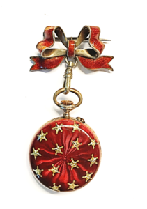 Reloj joya de dama para prender que su caja es en esmalte cobrizo anaranjado, sobre grabado lineal y cuajado de estrellas de cinco puntas en esmalte oro, decorando la totalidad de su tapa posterior.