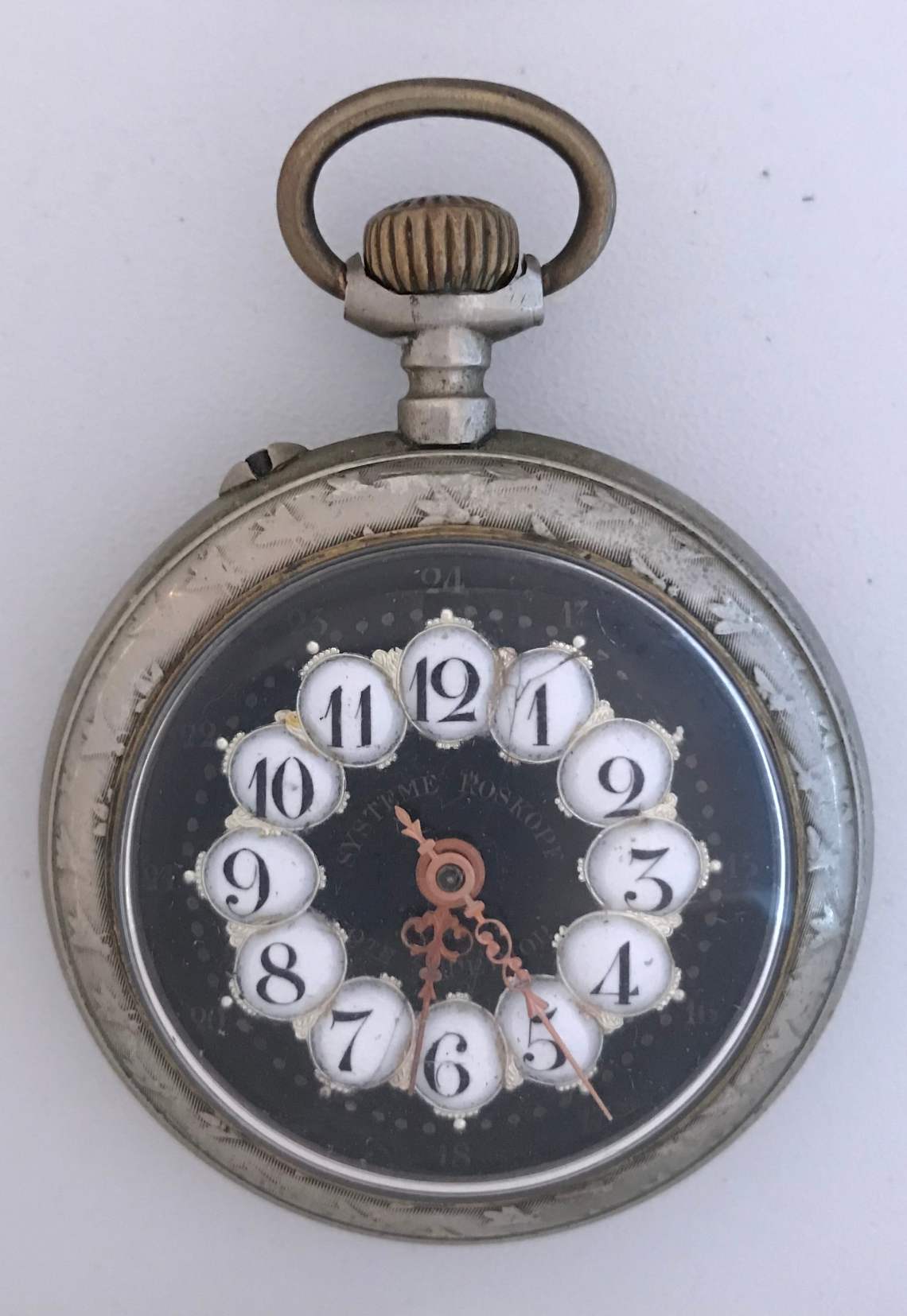 Reloj de bolsillo realizado por los maestros relojeros suizos de la marca ROSKOPF & CIE. Se trata de una pieza estilo lepine para caballero, en níquel y cromo, con inusual esfera de color negro a cartuchos blancos.