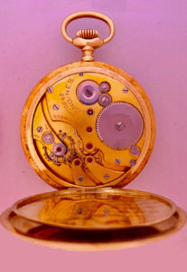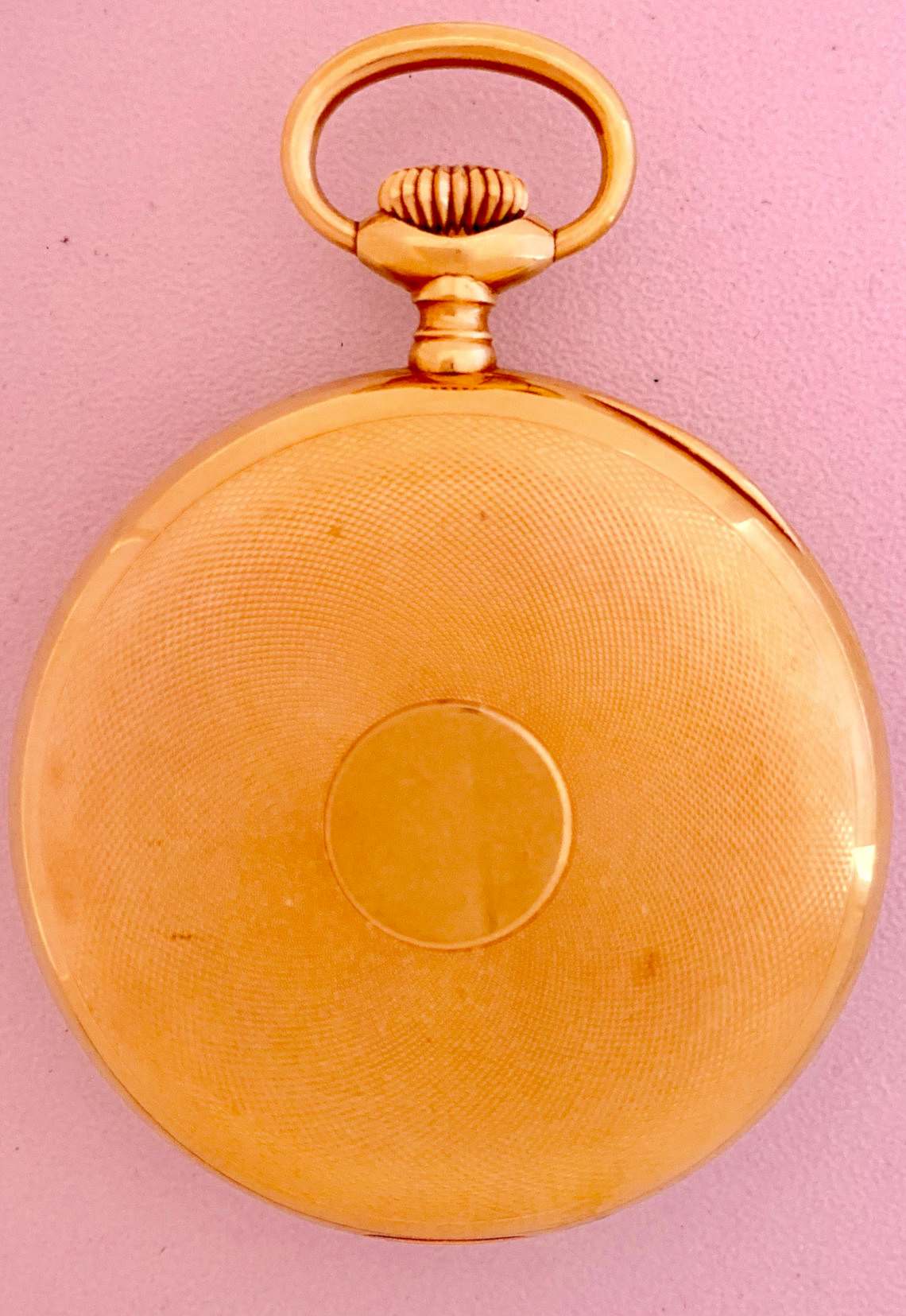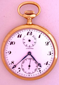 Reloj de bolsillo LONGINES en oro amarillo de 18 Kl. de 4.5cm de diámetro, estilo lepine con sistema muy inusual de 8 días cuerda con subesfera que lo indica a las 12 horas, en la que nos señala los días que quedan de cuerda para poderle dar más y que no llegue a pararse el reloj.
