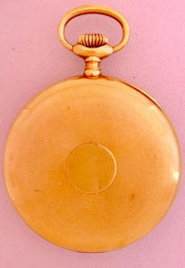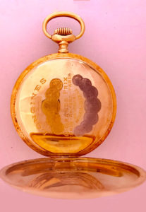 La caja es en oro de 18 Kl estilo lepine con bisel liso y tapa posterior a rombos concéntricos apretados estilo Guilloche, con escudo redondo en su centro para grabar las iniciales del propietario. Dispone de corona ranurada para el sistema de cuerda y cambio horario, así como de anilla de suspensión y colgante a las 12 horas. La placa de características ha sido grabada con los siguientes términos: “Longines, 6 Grands Prix; Paris – Anvers – Paris – Bruxelles – Milan – Berne” y las medallas obtenidas en estas ciudades. En el interior de la placa, se ha grabado: “EFCO, Longines, 18 Kl, Nº 2.970.645”. En la pletina a tres cuartos también aparece grabado: “Longines, 7 Jewels y el Nº 2.970.643.
