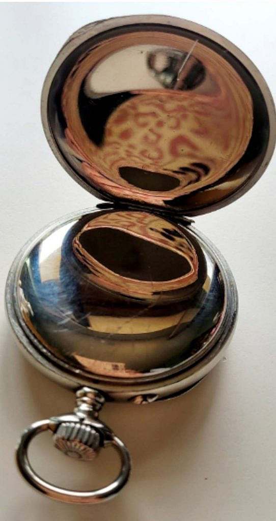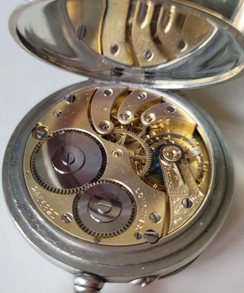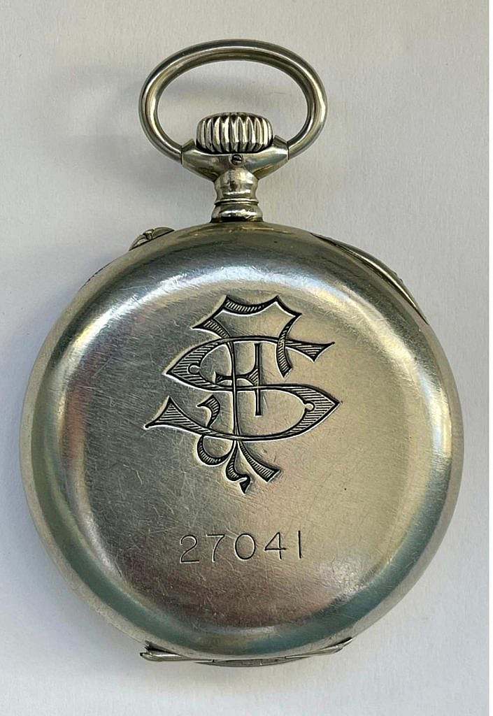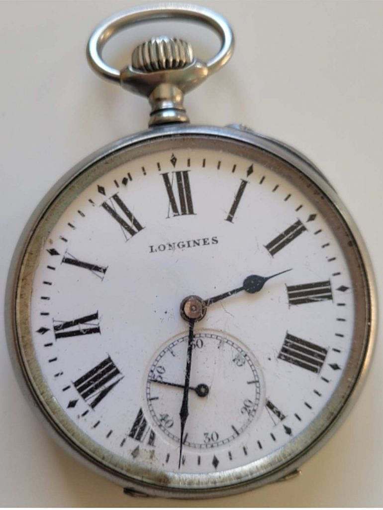 Reloj Longines con caja en níquel y cromo lisa en la que se han grabado en su tapa posterior las iniciales FS en grande y el número 27.041 de la FS siendo el reloj estilo lepine con el colgante la anilla de suspensión y la corona ranurada a las XII. La esfera es en esmalte blanco sobre cobre convexo con numeración romana en esmalte negro y segundero a las VI. La marca Longines se ha dispuesto debajo de la indicación horaria de las XII en esmalte negro. Las agujas son en laton negro de estilo Pica de Latigo.