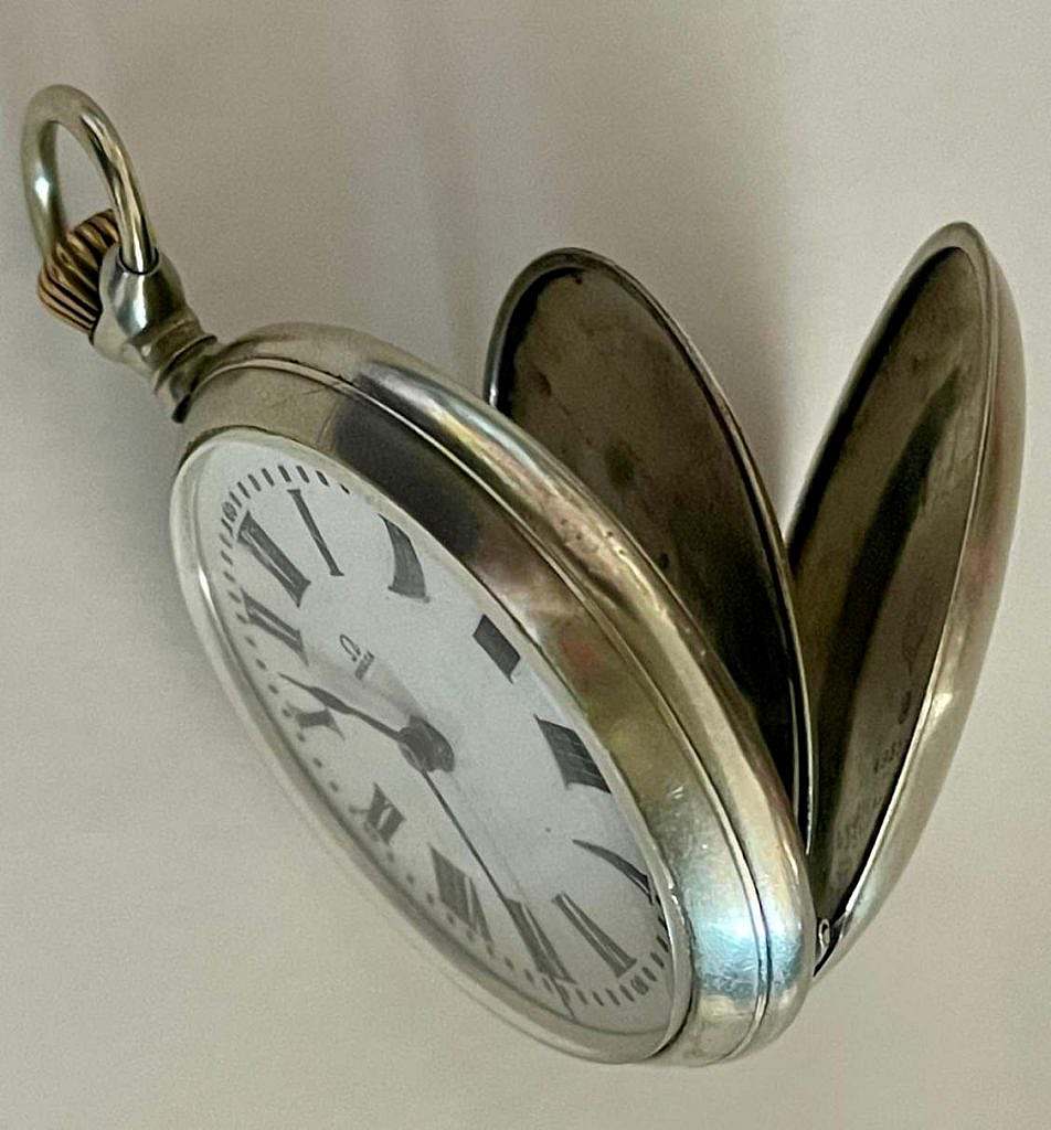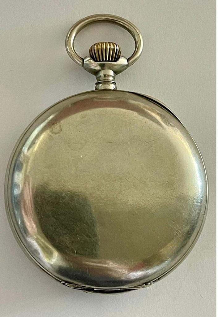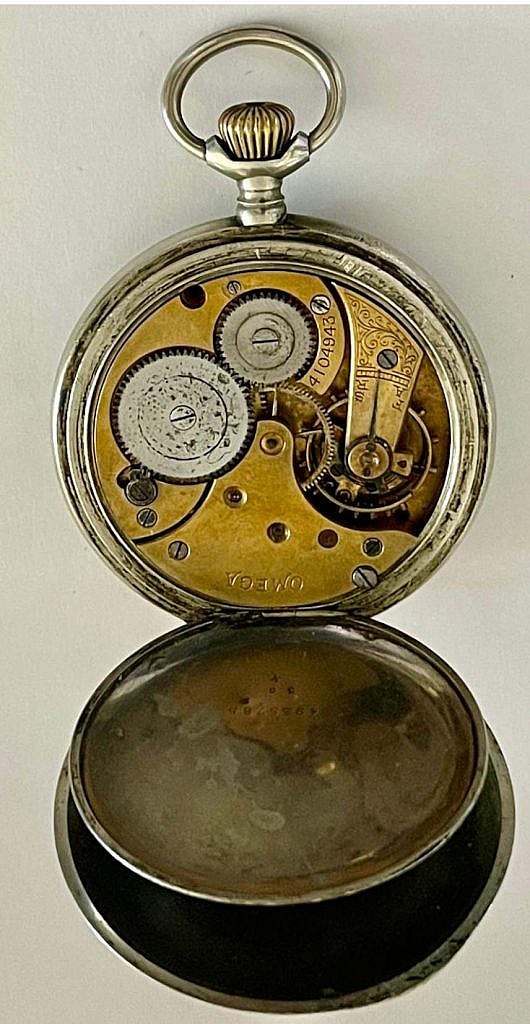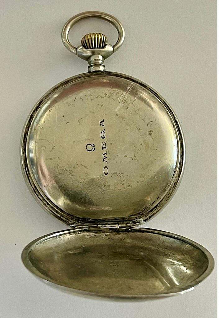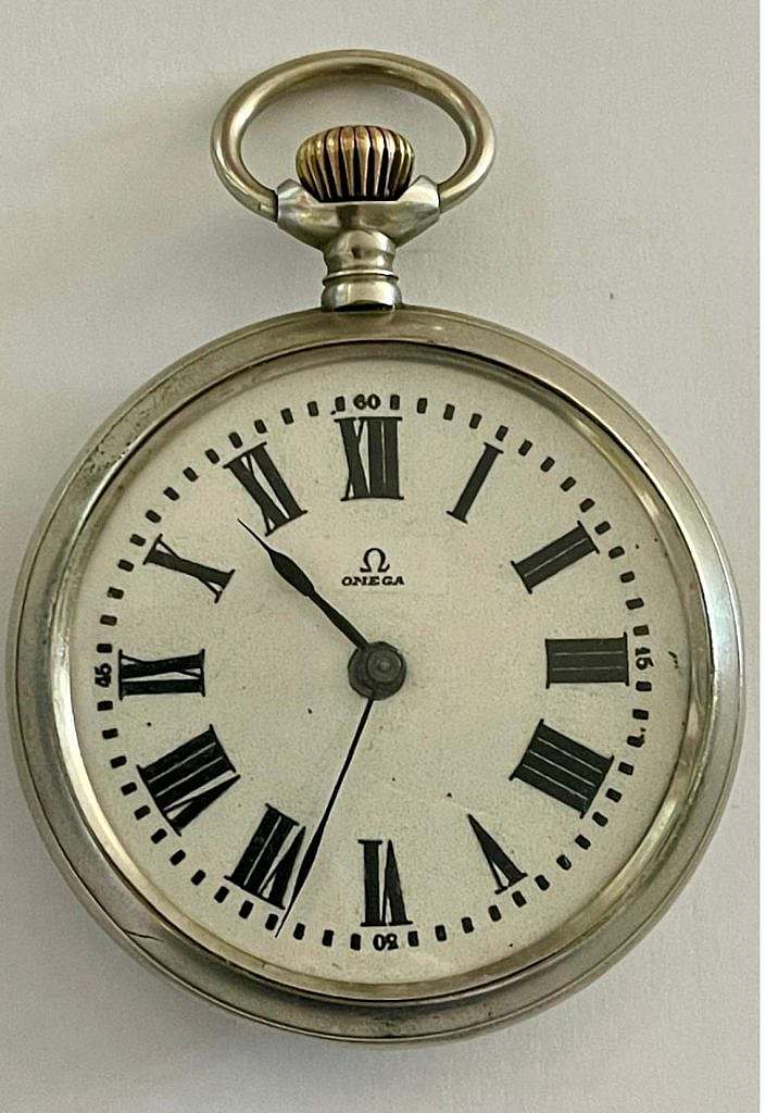 Reloj Omega de estilo Goliat (de muy grandes dimensiones de 6cm de diámetro) con caja lisa en níquel y cromo con la colgante anilla de suspensión y la corona ranurada a las 12. La esfera es en esmalte blanco sobre cobre convexo con numeración romana en esmalte negro. Debajo de la indicación horaria de las XII se ha esmaltado la marca Omega en esmalte negro. Las agujas son de grandes dimensiones de estilo pica de látigo. En la placa de características se ha grabado la marca y logo de Omega. La maquinaria ha sido grabada con lanumeración de serie 4.104.943. Que corresponde a circa 1912.