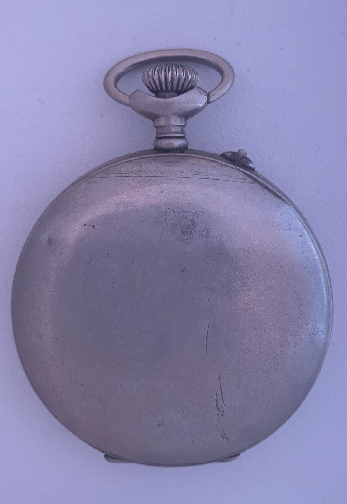Reloj de bolsillo saboneta en níquel y cromo  en cuya tapa anterior se grabó la siguiente dedicatoria: “Al cieco del Lavoro MARSALA CALOGERO l’Istituto Naz. Ass. Grandi Inv. Lavoro, Milano” (Al ciego, por su asignación de trabajo Marsala Colgero, el Instituto Naz. Ass. Grandi Inv. Lavoro, Milano).