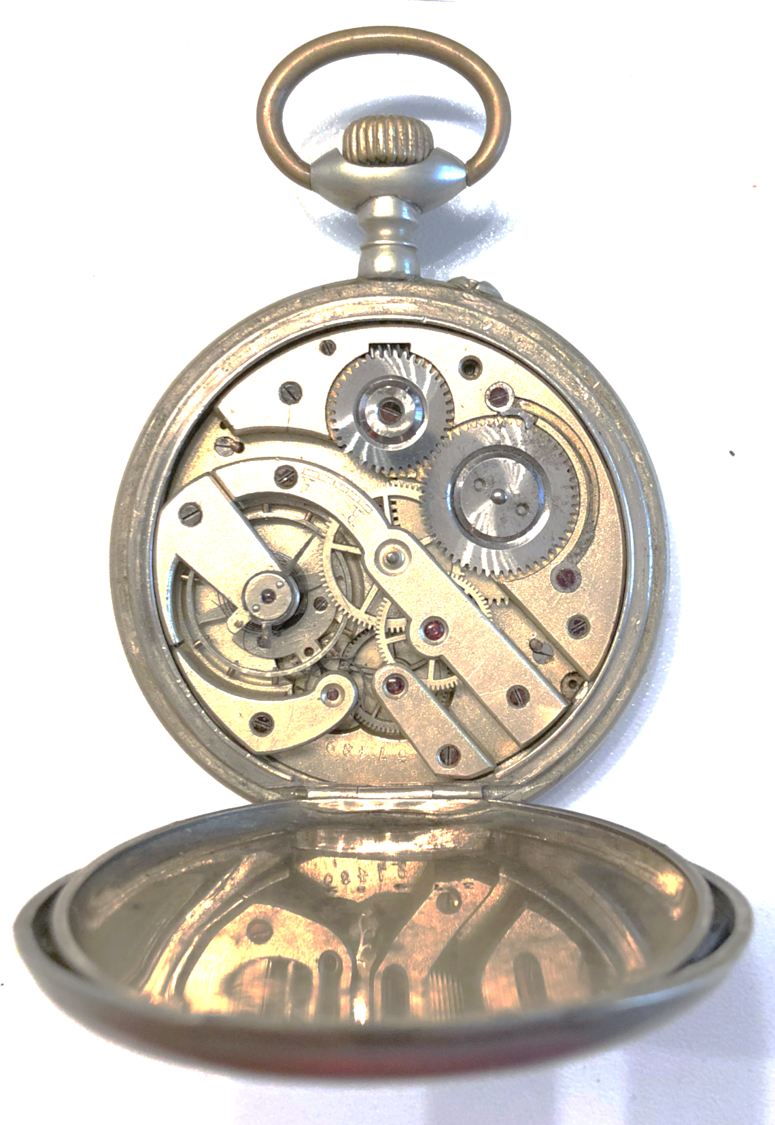 Reloj ‘Regulateur’ de estilo lepine con caja en níquel y cromo, lisa y pulida, de grandes dimensiones (su diámetro mide 7 cm).