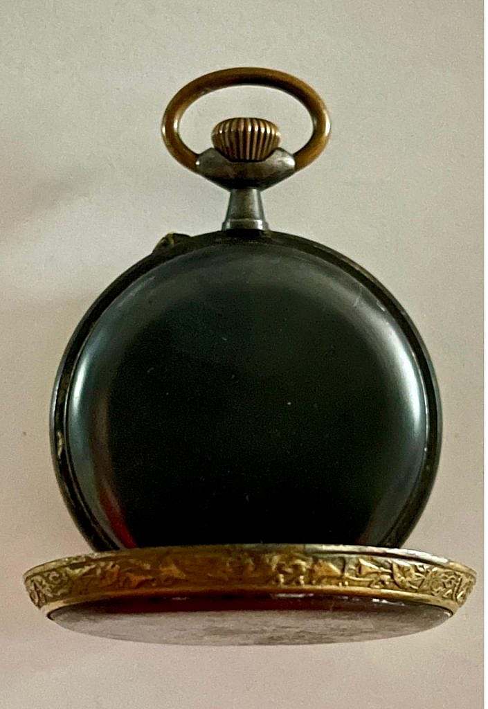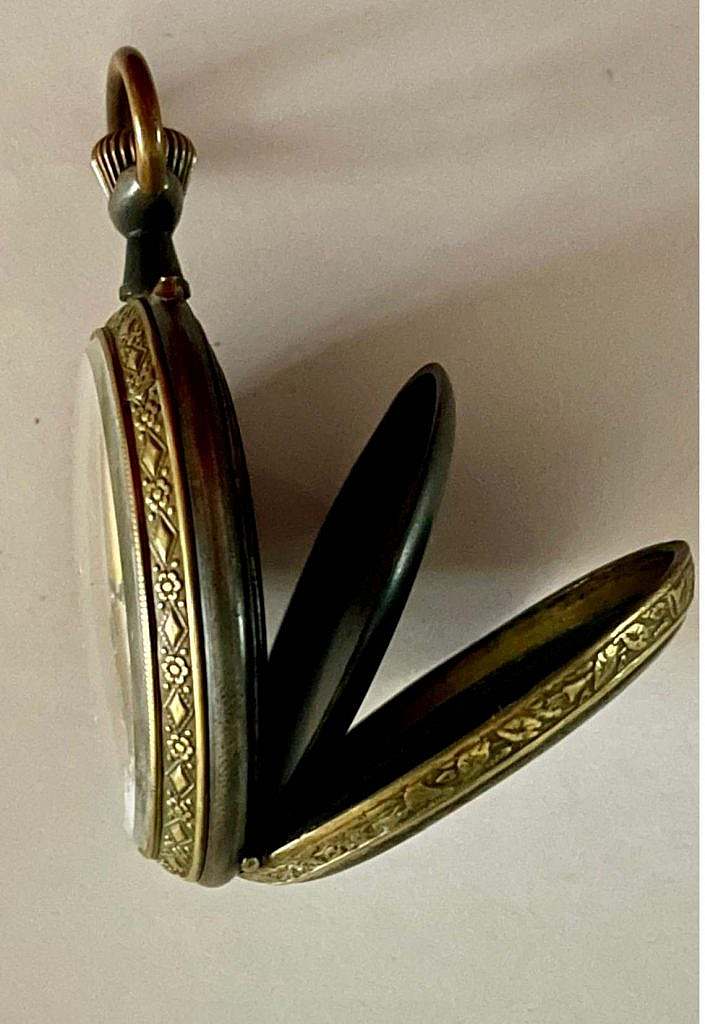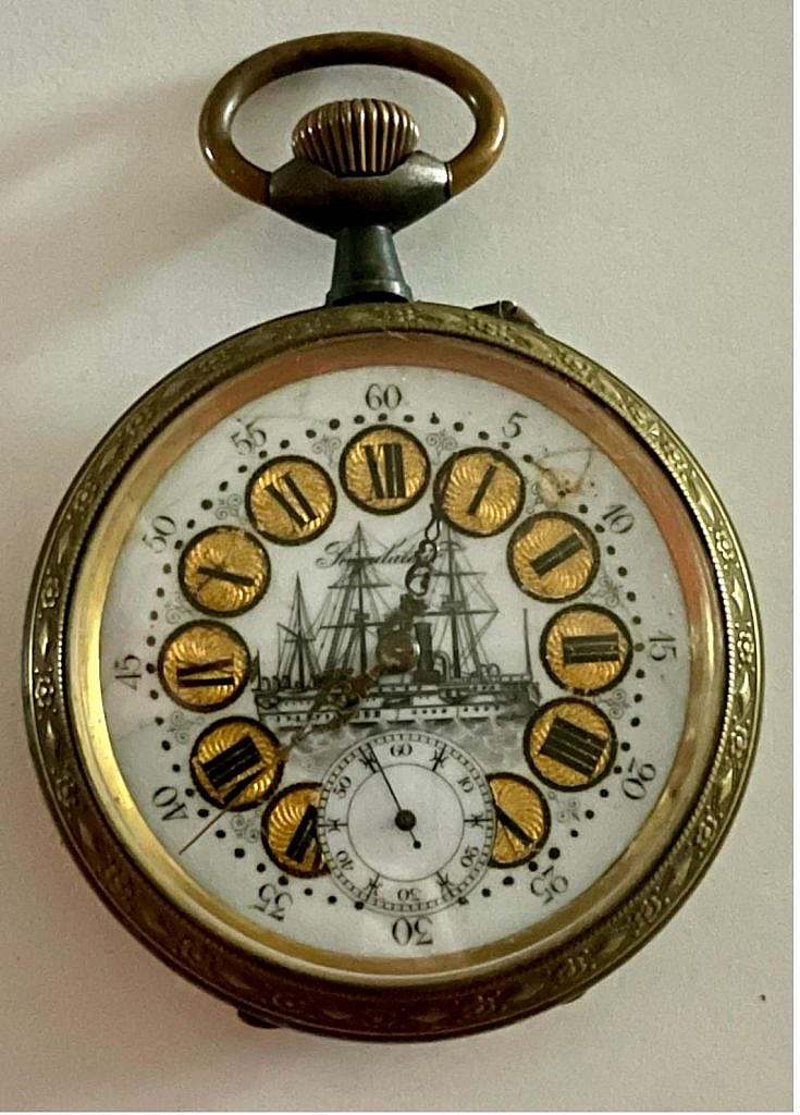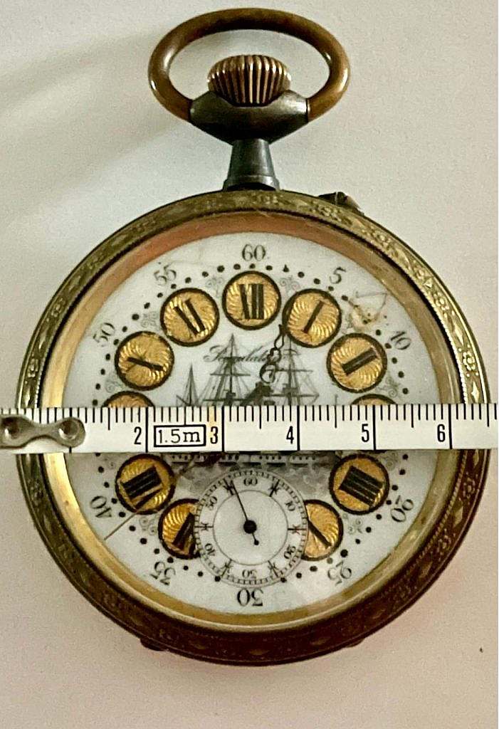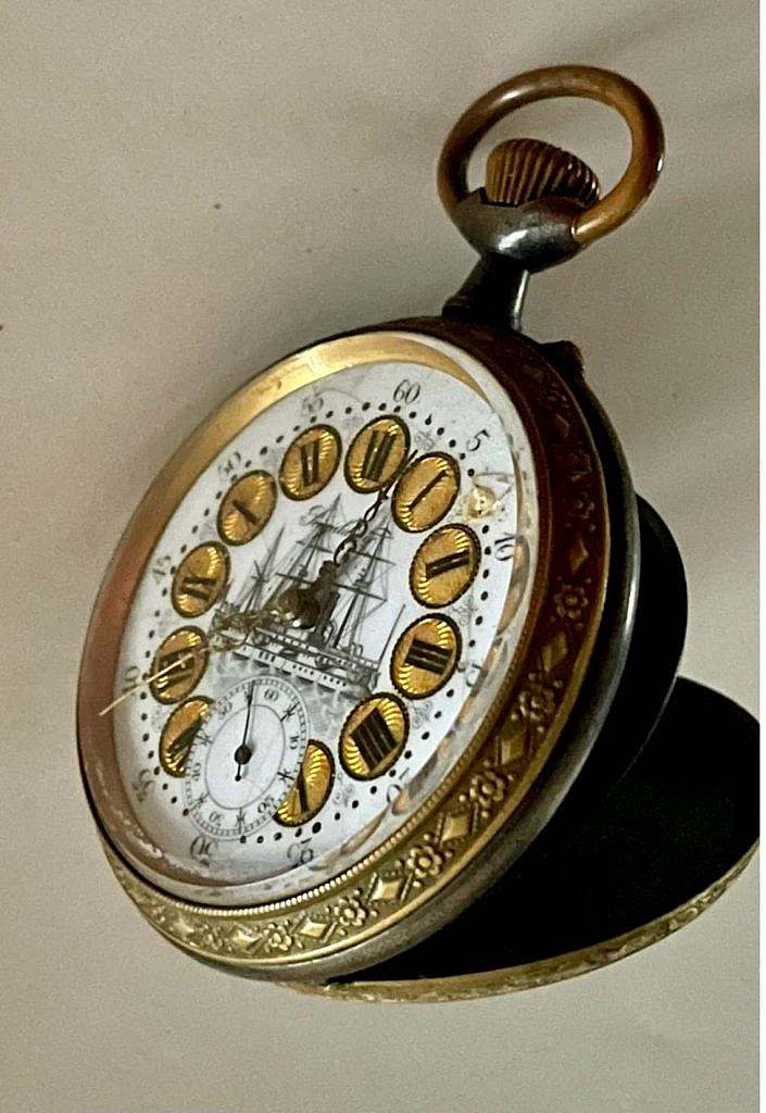 Reloj Regulador con caja pavonada y biseles dorados decorados con motivos vegetales y florales que realzan la belleza del reloj. La caja es de grandes dimensiones “Goliat” (con 6 cm de diámetro ) de estilo lepine con el colgante la anilla de suspensión y la corona ranurada a las XII. La esfera dispone de un inusual barco velero a vapor en su centro y pintada en esmalte negro reproduciendo el avance científico de un velero a motor de vapor así como inusuales cartuchos grabados a estilo Guilloche en esmalte amarillo traslucido que le otorgan una gran belleza y elegancia única a su esfera. Toda esa decoración en la esfera está montada sobre un esmalte blanco sobre cobre convexo con numeración romana en esmalte negro y las agujas en latón dorado estilo Luis XVI consegundero a las VI.