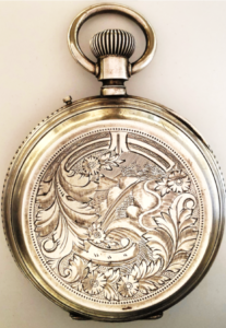Elegante reloj de bolsillo en plata de ley, estilo saboneta de grandes dimensiones (8 cm de diámetro). La caja ha sido profusamente grabada en su tapa anterior, protagonizada por un escudo central, para grabar las iniciales del propietario, coronado con la cabeza de un perro de la raza galgo, rodeada de una profusa decoración vegetal y floral. Así mismo, en su tapa posterior, se han grabado distintos motivos vegetales y florales.