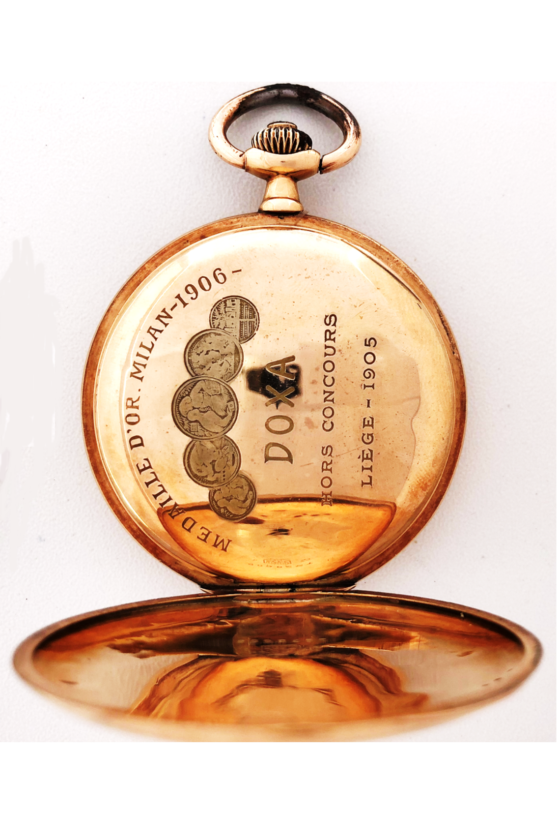 Reloj de bolsillo saboneta de la marca DOXA, término que en griego significa gloria. Fue fundada por Georges Ducommun en 1889 en Le Locle, Suiza, bajo el nombre «Georges Ducommun, Fabriques Doxa», siendo una marca considerada como alta relojería.
