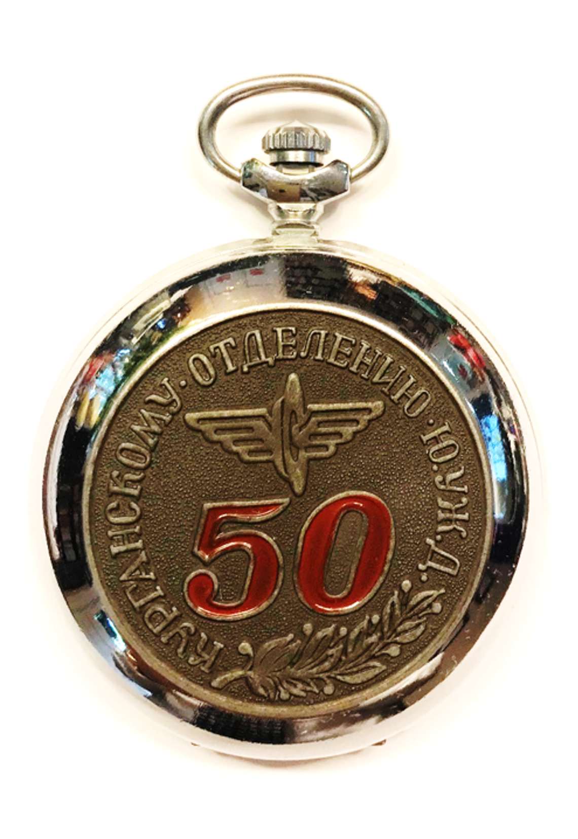 Reloj en níquel y cromo estilo saboneta moderno que reproduce fielmente los relojes de ferroviario de la URSS. Según la inscripción de la primera tapa anterior, conmemora el 50º Aniversario de los ferrocarriles de Kurgan, zona sur de los Urales (antigua URSS). En la segunda tapa posterior conmemora y agradece el trabajo y fiel dedicación de todos los empleados.