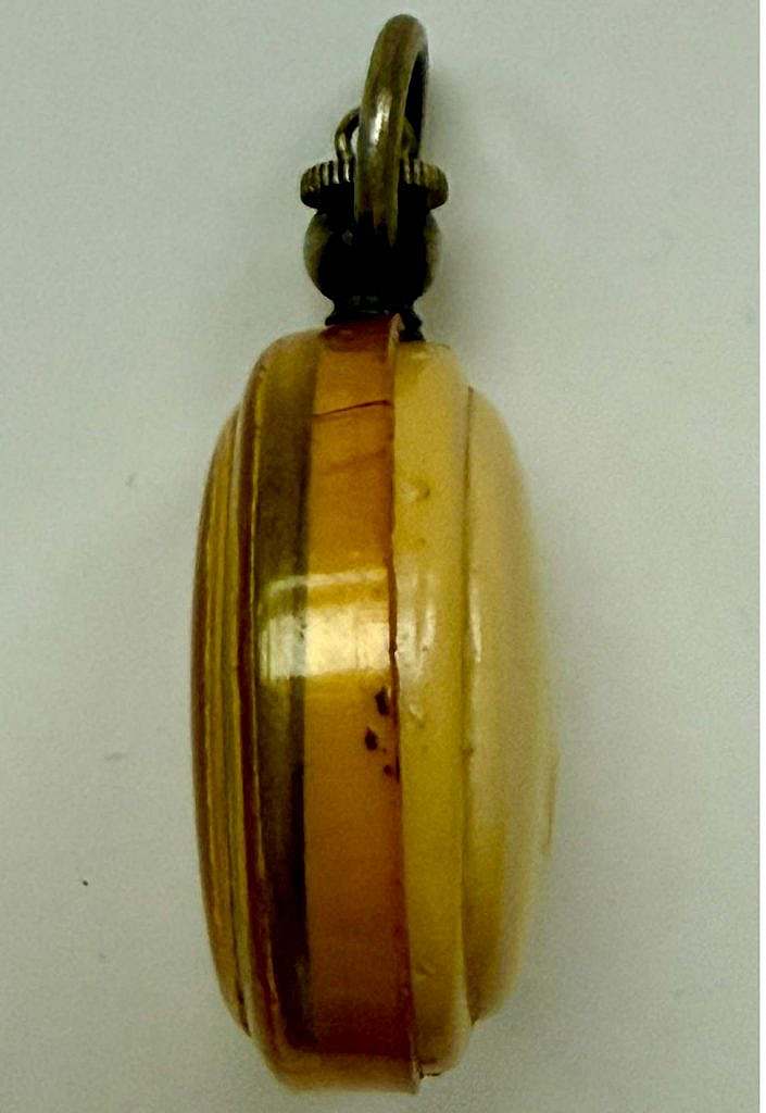 Materiales: Carcasa en material plástico temprano (probable celuloide o similar) con envejecimiento cromático marfil/ámbar; elementos metálicos en anilla/corona.