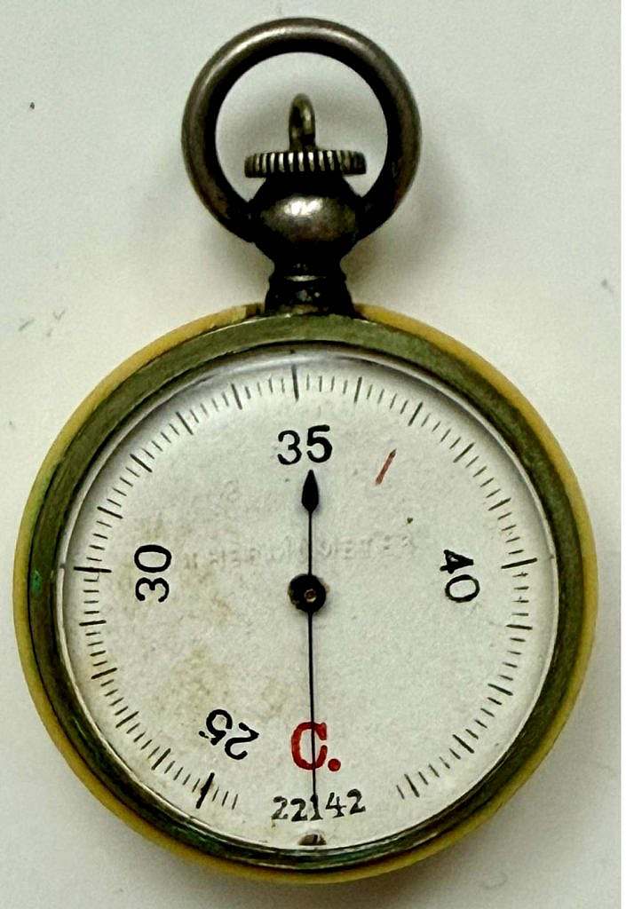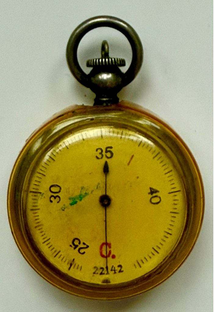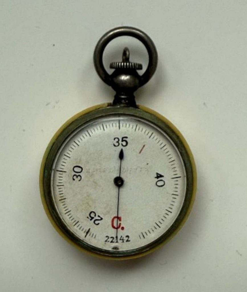 La esfera ofrece un rango estrecho —aproximadamente de 25 a 40 °C—, un detalle muy revelador. A diferencia de los termómetros meteorológicos clásicos, que suelen cubrir rangos amplios, aquí se privilegia el tramo de temperaturas “templadas–cálidas”, propias de ambientes interiores, situaciones de confort, proximidad corporal o control de condiciones suaves. Es decir: no es un instrumento para registrar el frío extremo ni para usos industriales de alta temperatura, sino un medidor pensado para el entorno cotidiano, donde el interés principal está en detectar variaciones relativamente pequeñas dentro de un rango práctico. Esta elección de escala, unida al diseño compacto, sugiere un objeto destinado a acompañar al usuario, a “vivir” con él, más que a permanecer fijo en un laboratorio o en una pared, de ahí su utilización en el campo de batalla con los soldados.
