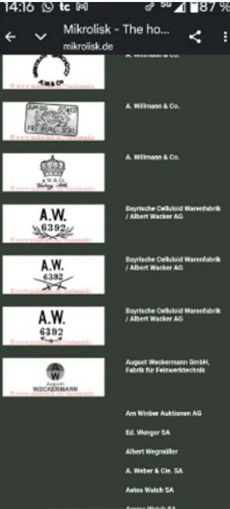 Marca / Identificación: “A.W.” en mayúsculas, dentro de corona de laurel, acompañado de numeración; marca documentada en repertorio especializado.